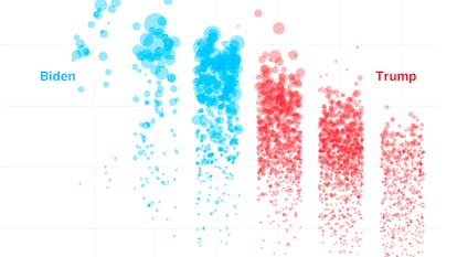Las elecciones de Estados Unidos han estado relativamente igualadas, como ocurrió con los comicios de 2016. Pero esa situación de empate no representa lo que ocurre en la mayoría de los condados del país, donde la polarización es profunda: el 62% de los votantes vive en territorios donde ha ganado un candidato por 33 puntos, es decir, con el doble de votos que su rival. Mucha gente apenas tiene vecinos que voten diferente: el 5% vive en condados donde Biden arrasó (4 a 1) y otro 3% vive en condados donde el que arrasó fue Donald Trump.