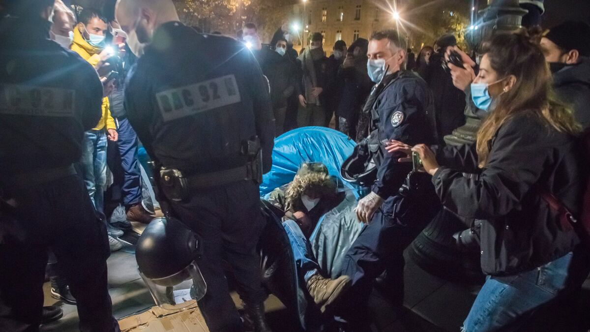 La evacuación violenta de un campamento temporal de migrantes erigido en pleno centro de París, en la noche del lunes, no ha dejado indiferente ni a los habituales críticos con los métodos de la policía francesa ni a sus defensores. Hubo gases lacrimógenos y agresiones a migrantes y periodistas. Todo, grabado por cámaras y teléfonos móviles a pocas horas de que la Asamblea Nacional aprobara este martes la polémica ley de “seguridad global” con 388 votos a favor, 104 en contra y 66 abstenciones. Una norma que limitará la difusión de imágenes de los agentes de la policía y la gendarmería. El Senado examinará el texto en enero.