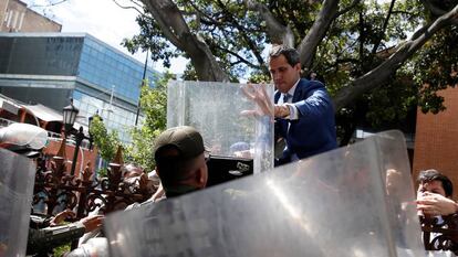 Guaidó no llegó a entrar al edificio del Parlamento. Tras la juramentación de Parra trató de acceder escalando unas verjas, mientras la policía lo impedía. Antes, no entró, según su equipo, porque quería garantizar que todos los dirigentes opositores pasaran junto a él y evitar que si entraban solo algunos dirigentes la bancada chavista y los disidentes tuviesen quórum suficiente para iniciar la sesión e impedir su reelección. “Si no entran todos no entra ninguno”, dijo Juan Guaidó en la entrada del Parlamento, donde las fuerzas de seguridad someten a una rigurosa verificación las credenciales de los parlamentarios.
