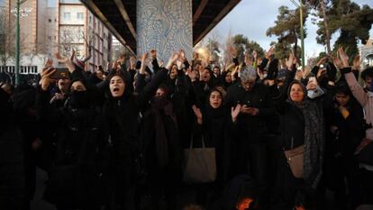 También los eslóganes han evolucionado del inicial “Matan a nuestros genios y los remplazan con clérigos”, a los “Fuera clérigos” o “Muerte al dictador”, que remiten a protestas anteriores contra el sistema islámico. Además, otros nuevos ponen en solfa a los poderosos Pasdarán, los miembros de la Guardia Revolucionaria. “Guardias, vosotros sois el dictador, vosotros sois nuestro ISIS”, en referencia al Estado Islámico que han ayudado a combatir en Irak y Siria, o “Qué vergüenza, guardias, dejad en paz el país”.
