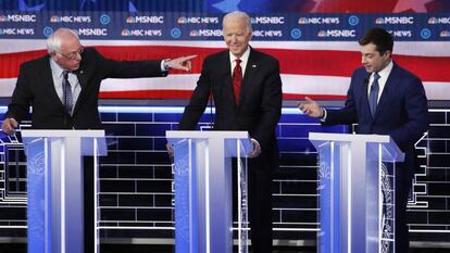 Los otros cinco candidatos le dejaron muy claro al magnate que no es bienvenido en esta carrera. En el minuto uno le preguntaron a Bernie Sanders qué pensaba de la candidatura de Bloomberg. “Para ganar a Donald Trump necesitamos la mayor participación de la historia”, dijo el senador, actualmente en cabeza en todas las encuestas. Esa movilización no se consigue, dijo, con alguien que como alcalde de Nueva York atacó con especial dureza a minorías como negros y latinos a los que hizo responsables de las cifras de delitos de la ciudad. Había pasado un minuto de debate y el polémico currículum del magnate ya estaba sobre la mesa.