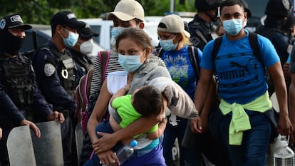 El Gobierno del presidente hondureño Juan Orlando Hernández ha desplegado a la policía militar y ordenado que se establezcan retenes en la ruta de los migrantes, para evitar que avancen hacia el norte. Además, se ha establecido un toque de queda en el país. Mientras, Guatemala ha ordenado a su Ejército y a la Policía Nacional Civil que creen puestos de control en la carretera hacia el océano Atlántico, después de que el presidente Alejandro Giammattei decretara el jueves el estado de prevención en los departamentos de Izabal, Zacapa, Chiquimula, Jutiapa, Santa Rosa, El Progreso y Petén. “Le suplicamos señor presidente que nos permita pasar por Guatemala, nos estamos muriendo de hambre”, ha pedido uno de los migrantes, citado por la agencia EFE.