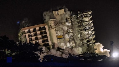 Se hacía imperante derribar la parte del inmueble que seguía en pie tras el colapso el pasado 24 de junio del edificio conocido como Champlain Towers, en la localidad de Surfside, colindante con Miami (Florida). Al final de la noche del domingo, una empresa de derribos hizo coincidir el estruendo que provocan los fuegos artificiales, debido a la festividad del 4 de julio en EE UU, con la implosión de la construcción que mantenía un frágil y peligroso equilibrio, para que la detonación de la caída vertical del edificio casi se confundiera con el estruendo de la noche de la independencia. Tras reanudarse los trabajos de rescate, la cifra de muertos ha ascendido a 27 y la de desaparecidos se ha rebajado a 118. Dos de las últimas víctimas mortales halladas eran menores, de 10 y 4 años.