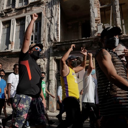 Las calles de La Habana y de varias ciudades y pueblos de Cuba vivieron este domingo las mayores manifestaciones contra el Gobierno desde el maleconazo de 1994, durante el llamado Periodo Especial, cuando cientos de cubanos salieron a protestar por la precaria situación económica en vísperas del estallido de la crisis de los balseros. El detonante del plantón de este domingo, en el que participaron miles de personas en todo el país y se saldó con centenares de detenidos, fue la grave escasez y las penurias que sufren los habitantes de la isla, agravadas por los efectos de la pandemia. Inusuales gritos de “libertad” y “abajo la dictadura” se pudieron escuchar en La Habana Vieja y otros lugares de Cuba, amplificados por las redes sociales, que en los últimos meses han sacudido el panorama político del país caribeño.