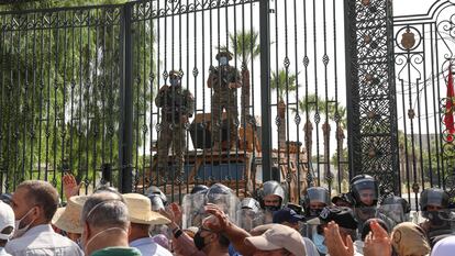 Túnez ha amanecido este lunes sumido en la confusión respecto a su futuro. Horas después de que en la noche del domingo, de forma inesperada, el presidente, Kais Said, se arrogara poderes ejecutivos plenos, provocando la peor crisis institucional de Túnez desde la revolución democrática de 2011, cientos de personas se han reunido esta mañana frente al Parlamento para protestar. Varios enfrentamientos sacudieron las inmediaciones del edificio tunecino, entre seguidores del presidente y simpatizantes del principal partido, Ennahdha. Las fuerzas de seguridad no dejaron acceder al edificio en aplicación de las medidas impuestas por el presidente, que ha destituido al primer ministro, Hichem Mechichi, y ha suspendido un mes la actividad del Parlamento, a cuyo edificio no se ha permitido el acceso a nadie. La oposición mantiene una actitud desafiante frente a un acto que califican de “golpe de Estado”. Este lunes, además, Said ha anunciado el cese de los ministros de Defensa y Justicia, Ibrahim Bartaji y Hasna Ben Slimane.