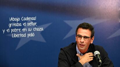 Henrique Capriles vuelve a tomar el micrófono en un momento crucial para la oposición. Esta semana comenzó la inscripción de las candidaturas para las elecciones regionales y locales del 21 de noviembre. Pero el tiempo avanza y hasta ahora la oposición no ha planteado una posición clara sobre esta nueva encrucijada electoral, aunque hay candidatos de todos los partidos haciendo campaña en barrios y comunidades. Capriles ha llamado a votar y pide sumar esfuerzos para lograr candidaturas unitarias a través de consensos, encuestas o primarias allá donde el margen de tiempo permita organizarlos. “Tenemos que hacer uso de nuestro derecho, que la gente se exprese, pese a todas las tropelías que han hecho con el derecho al voto”, dijo el dirigente de Primero Justicia en una rueda de prensa este miércoles. “Voy a votar, eso lo tengo claro. Y tenemos que asumir este proceso que está a la vuelta de la esquina sin complejos. Tenemos que presentar candidatos y liderazgos locales a todo el país y aglutinar el descontento”, añadió.