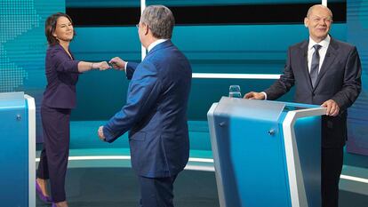 El primero de los tres debates electorales que verán los alemanes en la televisión antes de las elecciones del 26 de septiembre empezó con una pregunta un poco rara, que los tres candidatos se negaron a responder. Los moderadores les preguntaron por qué sus adversarios no serían buenos cancilleres. Todos se excusaron para no hablar mal del contrario, algo que en cierto modo mantuvieron durante el resto del debate. No hubo ataques personales, ni se recordaron unos a otros sus tropiezos durante la campaña ni las miserias previas, como el papel del ministro de Finanzas, el socialdemócrata Olaf Scholz, en el fiasco de Wirecard.