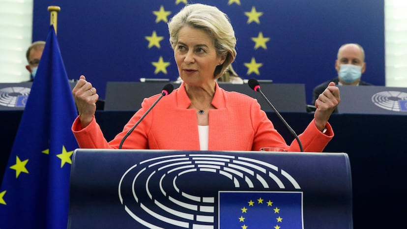 Su intervención ha tratado de subrayar el momento de inflexión. “Hemos hecho muchas cosas bien”, ha explicado, al hablar de los fondos SURE con los que se ha “apoyado a más de 31 millones de trabajadores y 2,5 millones de empresas”. Sus palabras llegan en un momento en que ya se ha tocado fondo y la curva remonta y todo parece, al menos de momento, regresar adonde se dejó en 2019. La pandemia ha dejado más de 750.000 muertos en la UE, cierto, y provocado la mayor caída del PIB europeo desde la Segunda Guerra Mundial. Pero ya hay “más de un 70% de la población adulta europea completamente vacunada”, ha presumido la presidenta del Ejecutivo comunitario: eso son más de 250 millones de personas que han sentido en su brazo la apuesta de Bruselas por una estrategia sanitaria conjunta, millonaria y en la que “hoy, a pesar de todas las críticas, Europa está entre los líderes mundiales”.