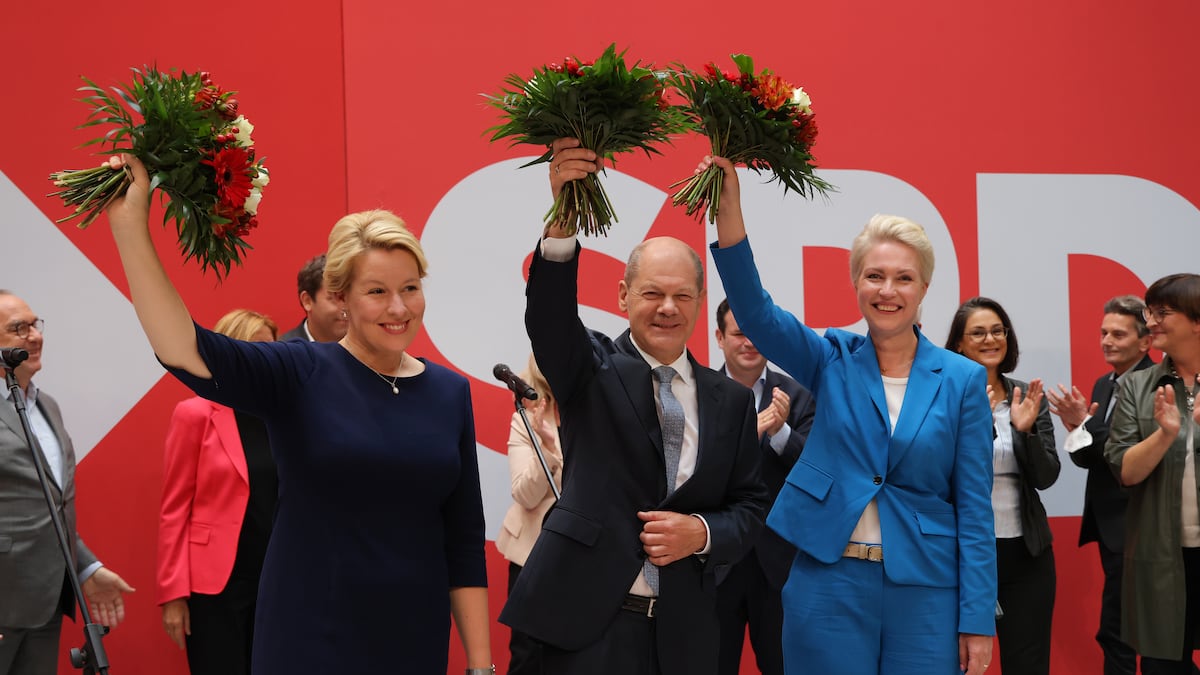 Hace tiempo que la casa Willy Brandt, sede berlinesa del Partido Socialdemócrata (SPD), no vivía un día tan feliz. Un hombre y dos mujeres, cada uno con un ramo de flores en la mano, eran en la mañana de este lunes la imagen de la victoria. Olaf Scholz, vencedor por la mínima en las elecciones federales del día anterior, comparecía junto a Franziska Giffey y Manuela Schwesig, también ganadoras en los comicios del domingo en Berlín y en el pequeño Estado oriental de Mecklemburgo-Pomerania Occidental. El SPD tiene motivos para celebrar, pero eso no quiere decir que el camino hasta hacerse con el poder esté despejado.