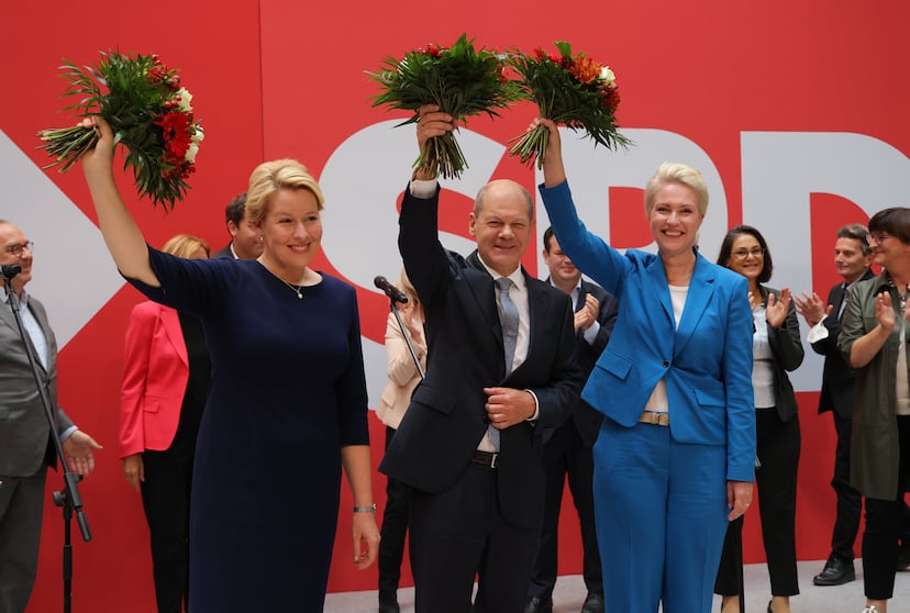 Hace tiempo que la casa Willy Brandt, sede berlinesa del Partido Socialdemócrata (SPD), no vivía un día tan feliz. Un hombre y dos mujeres, cada uno con un ramo de flores en la mano, eran en la mañana de este lunes la imagen de la victoria. Olaf Scholz, vencedor por la mínima en las elecciones federales del día anterior, comparecía junto a Franziska Giffey y Manuela Schwesig, también ganadoras en los comicios del domingo en Berlín y en el pequeño Estado oriental de Mecklemburgo-Pomerania Occidental. El SPD tiene motivos para celebrar, pero eso no quiere decir que el camino hasta hacerse con el poder esté despejado.