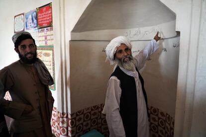 Mohamed Omar llegó a Singesar siendo joven, en torno a la veintena de años tendría, calcula Abdul Majid. El jefe del pueblo, que debe rondar los 1,90 metros y es el más alto con diferencia de todos los presentes, eleva su mano hasta arriba para recordar que su estatura es la misma que la del más insigne de los vecinos que han tenido. El mulá Omar “fue un gran hombre, es el responsable de que hoy tengamos una vida mejor”, comenta Abdul Basir Nuri, un talibán de unos 20 años que no se separa de su kaláshnikov. Delante de él, dos jóvenes extraen agua mediante una manguera que fluye de un depósito gracias a un generador. La luz procede de alguna que otra placa solar. Lo de la vida mejor no se refiere a lo material. “Estamos bendecidos y damos gracias a Dios”, aclara.