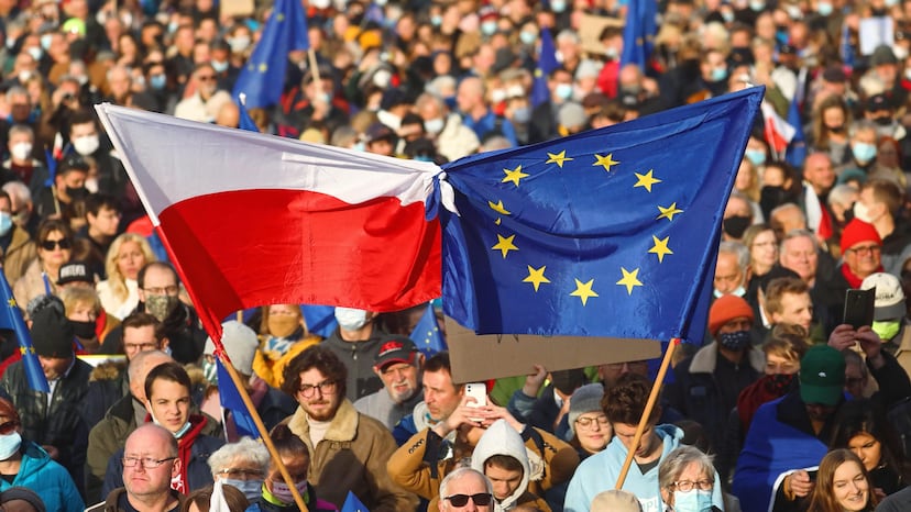 Decenas de miles de polacos salieron este domingo a las calles de más de 100 ciudades del país y de algunas capitales europeas para reivindicar su europeísmo frente al monumental desafío de esta semana a la Unión Europea del Gobierno ultraconservador polaco. “Polonia está en la UE y estamos orgullosos”, “Nosotros nos quedamos”, gritaban a coro miles de voces en la plaza del Castillo de Varsovia, con el Himno a la Alegría de Beethoven de fondo, símbolo de la Unión, y banderas europeas ondeando. Un funcionario en la cincuentena que no quiso revelar su nombre por miedo a represalias, resumía por qué había acudido a la protesta: “Polonia se está quedando sola, se está aislando, y tenemos miedo”.
