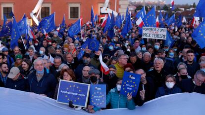 Un día después de que decenas de miles de polacos salieran a la calle en más de 100 ciudades del país para reivindicar su pertenencia a la UE, el primer ministro de Polonia, Mateusz Morawiecki, ha sido breve y elocuente. “El Polexit es fake news”, ha escrito este lunes en un post publicado en Facebook. Se refería el jefe de Gobierno a que la hipotética salida de Polonia de la UE es una falsedad, un mensaje reiterado por el portavoz del Ejecutivo, que insistía en que la idea de salir de la UE “no existe”. En el país, medios cercanos al partido ultraconservador Ley y Justicia (PiS) han ignorado las masivas protestas o las han minimizado.