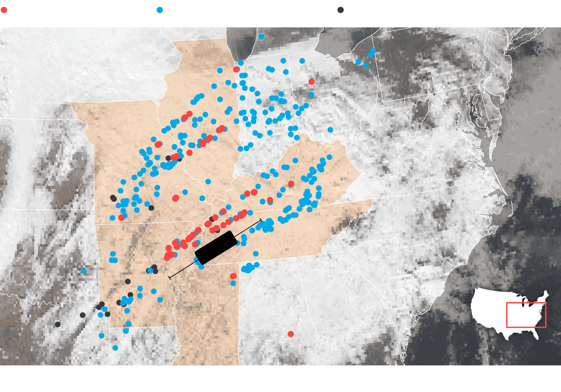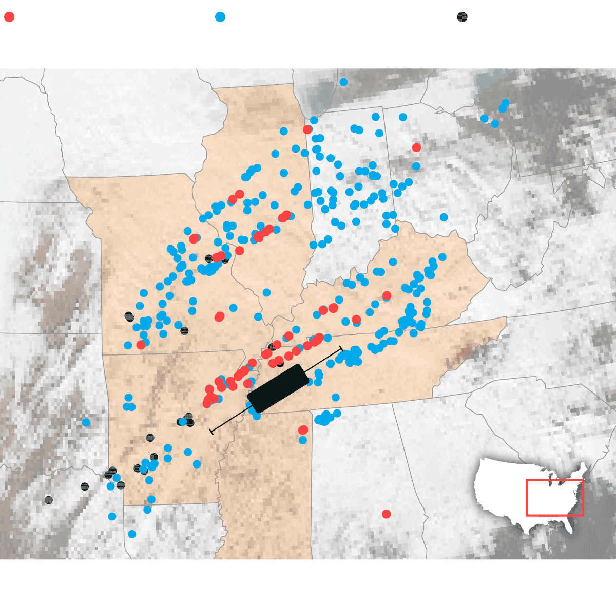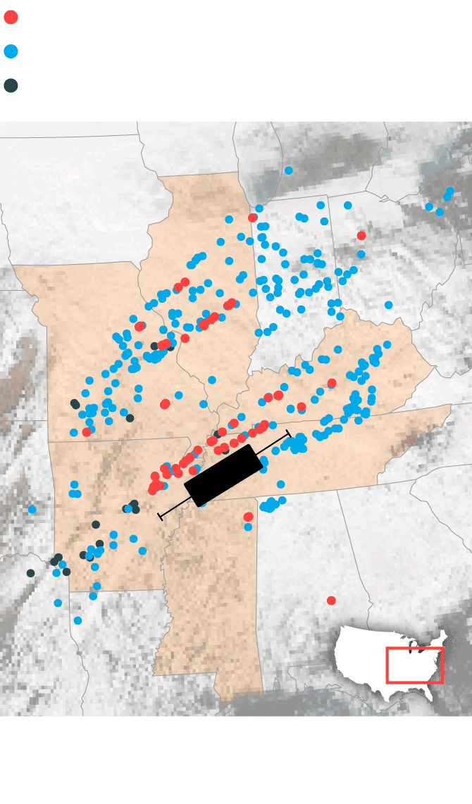 La cadena de 69 tornados que devastó el pasado fin de semana el centro de Estados Unidos fue una sucesión de fenómenos meteorológicos que incluyó, además, 373 episodios de fuertes vientos y otros 24 de granizo, según los últimos datos actualizados del Servicio Nacional de Meteorología del país (NWS, por sus siglas en inglés). La violencia de esta ola de tornados y tormentas, una de las más mortíferas de la historia estadounidense, arrasó una zona de más de 400 kilómetros en línea recta que afectó a seis Estados (Arkansas, Illinois, Kentucky, Misuri, Misisipi y Tennessee) dejando a su paso un reguero de destrucción que se ha cobrado ya la vida de cerca de un centenar de personas.