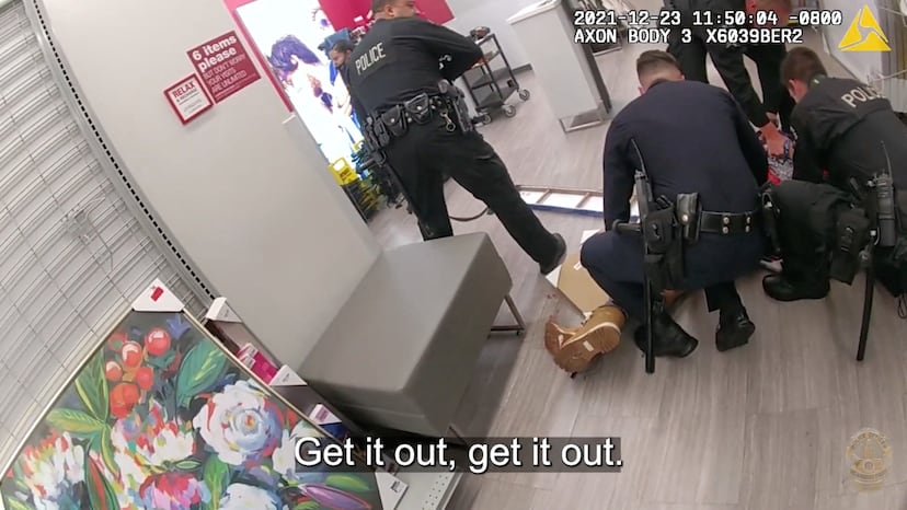 Un grupo de policías entró a la tienda tras recibir varias llamadas de socorro. “¡Tengo un cliente hostil en mi tienda que ataca a los clientes!” dijo un empleado del comercio en una llamada al 911. Los agentes se acercaron al sospechoso ordenándole que se calmara. Mientras recorrían la tienda encontraron a la mujer golpeada ensangrentada en el suelo. Los agentes le gritaron dos veces al hombre que se detuviera y un policía armado con un rifle le disparó tres veces.