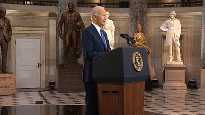 El 6 de enero de 2021, una marabunta de seguidores del entonces presidente Trump, derrotado en las elecciones, invadió el Congreso para tratar de boicotear la confirmación de la victoria de Biden. Actuaban agitados por un bulo de fraude electoral que el republicano mantiene a día de hoy y que un 70% de sus votantes sigue creyendo, de ahí el tono de gravedad y de urgencia en el discurso del actual gobernante, quien advirtió de que la democracia estadounidense vive “un punto de inflexión”.