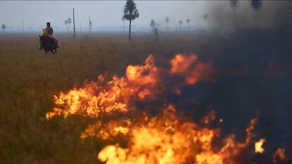 Casi el 10% de la provincia argentina de Corrientes, unas 800.000 hectáreas, ha sido arrasada por el fuego. La sequía histórica que desde hace dos años azota la provincia ha propiciado que las llamas devoren incluso la quinta parte de los Esteros del Iberá, el mayor humedal de Argentina. Sin las barreras naturales de agua que suelen actuar como cortafuegos en esta región, bosques nativos, pastizales, explotaciones forestales y tierras ganaderas arden fuera de control. Las escasas lluvias caídas en las últimas horas y los bomberos desplegados sobre el terreno son insuficientes para detener los numerosos focos activos en la provincia, que ha sido declarada en catástrofe ambiental.
