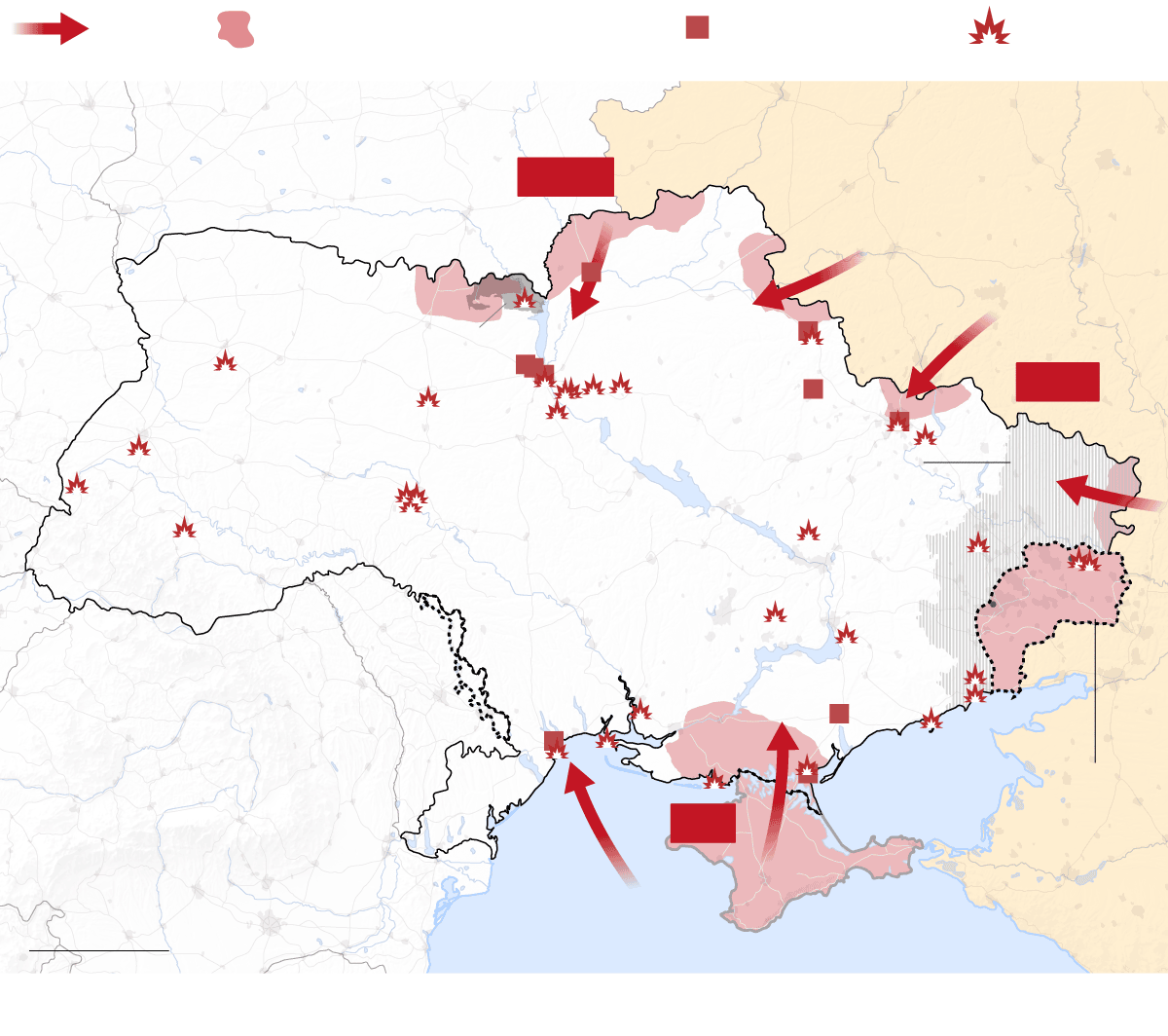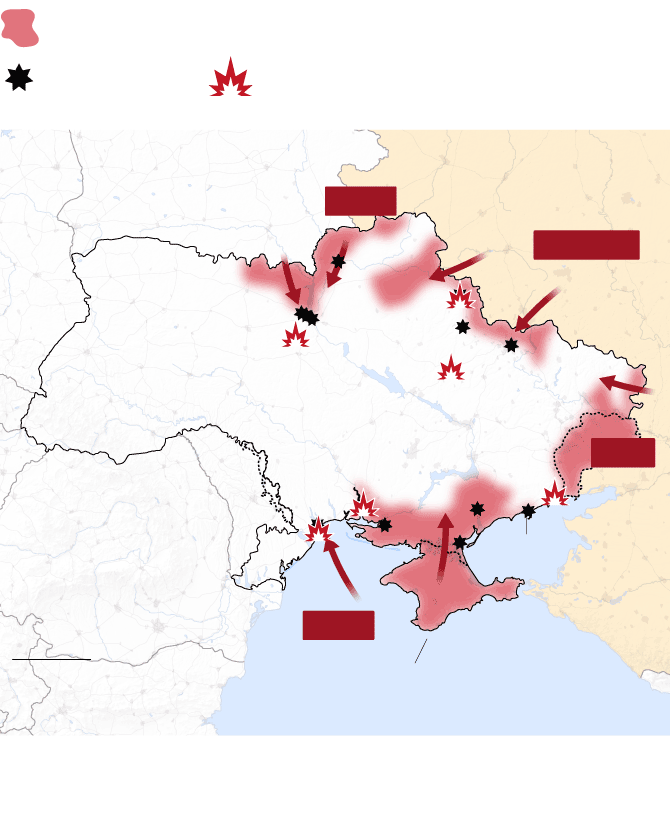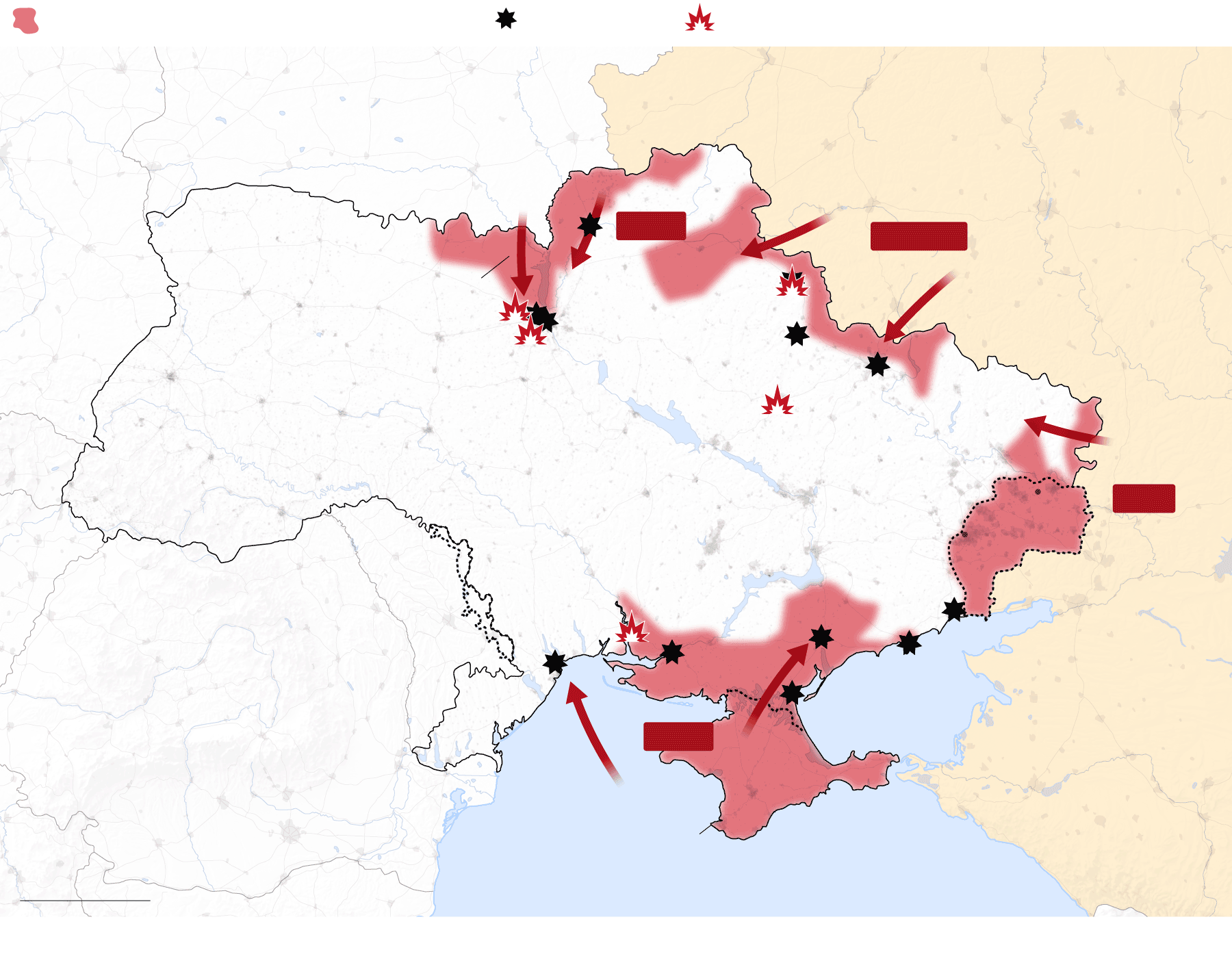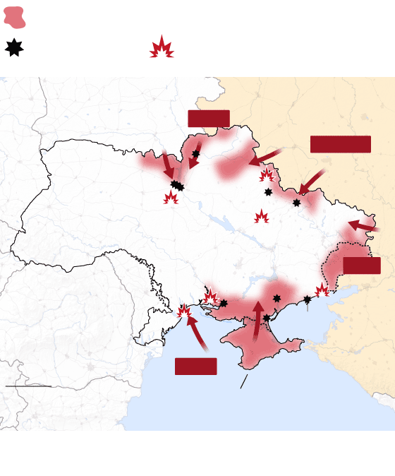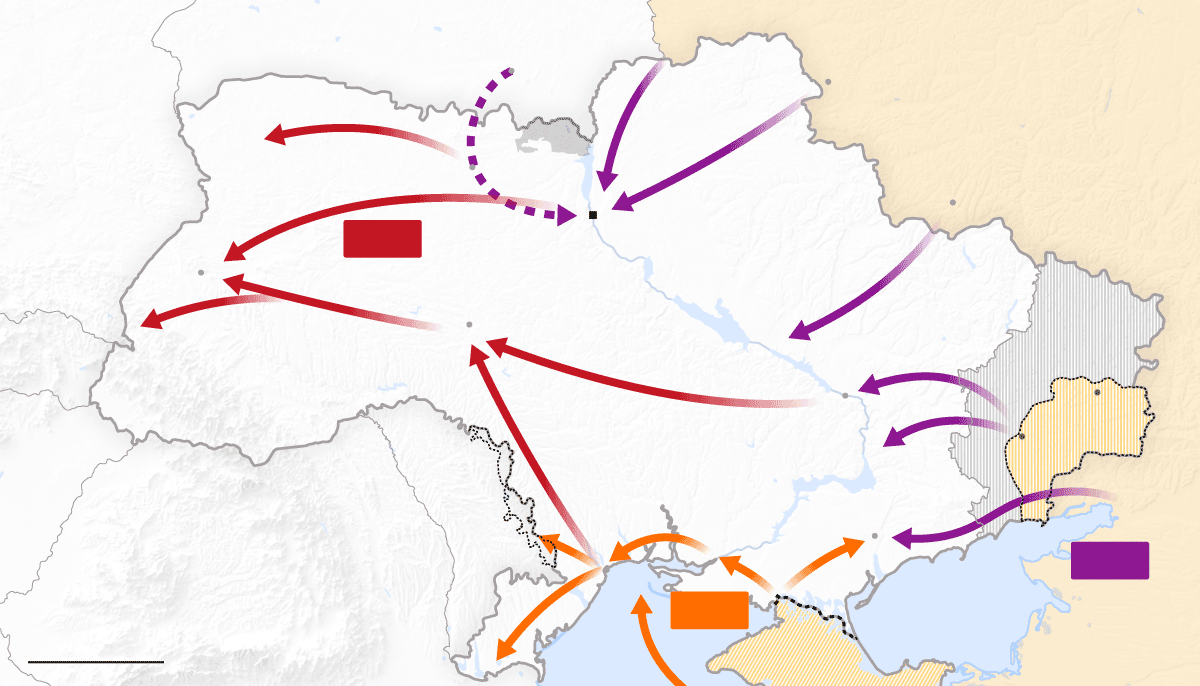 Las tropas rusas atacan Ucrania por tres frentes: al norte, por la frontera de Bielorrusia; al este, a través de la frontera con Rusia; y al sur, desde Crimea, la península que Rusia invadió y se anexionó ilegalmente en 2014. El Gobierno ucranio denuncia “un ataque a gran escala desde múltiples direcciones”. Las tropas rusas ocuparon terreno en todos los frentes, como mostraban los datos del Instituto para el Estudio de la Guerra (IWS).