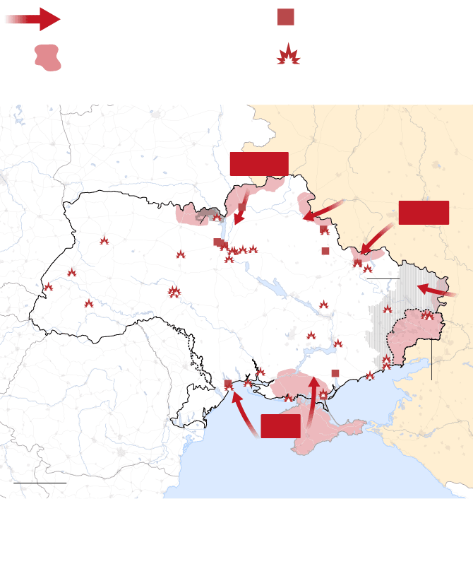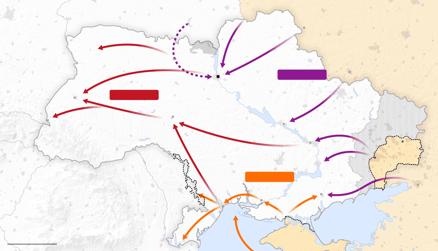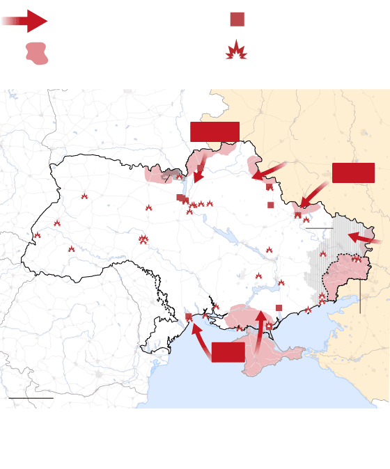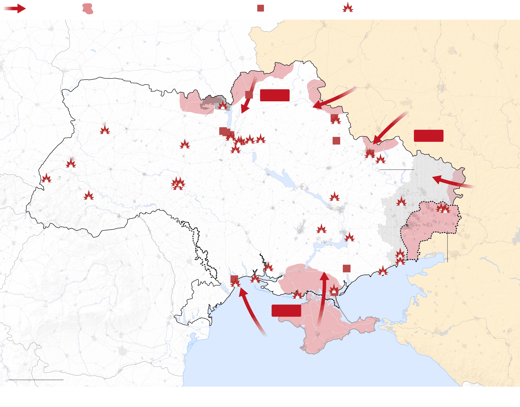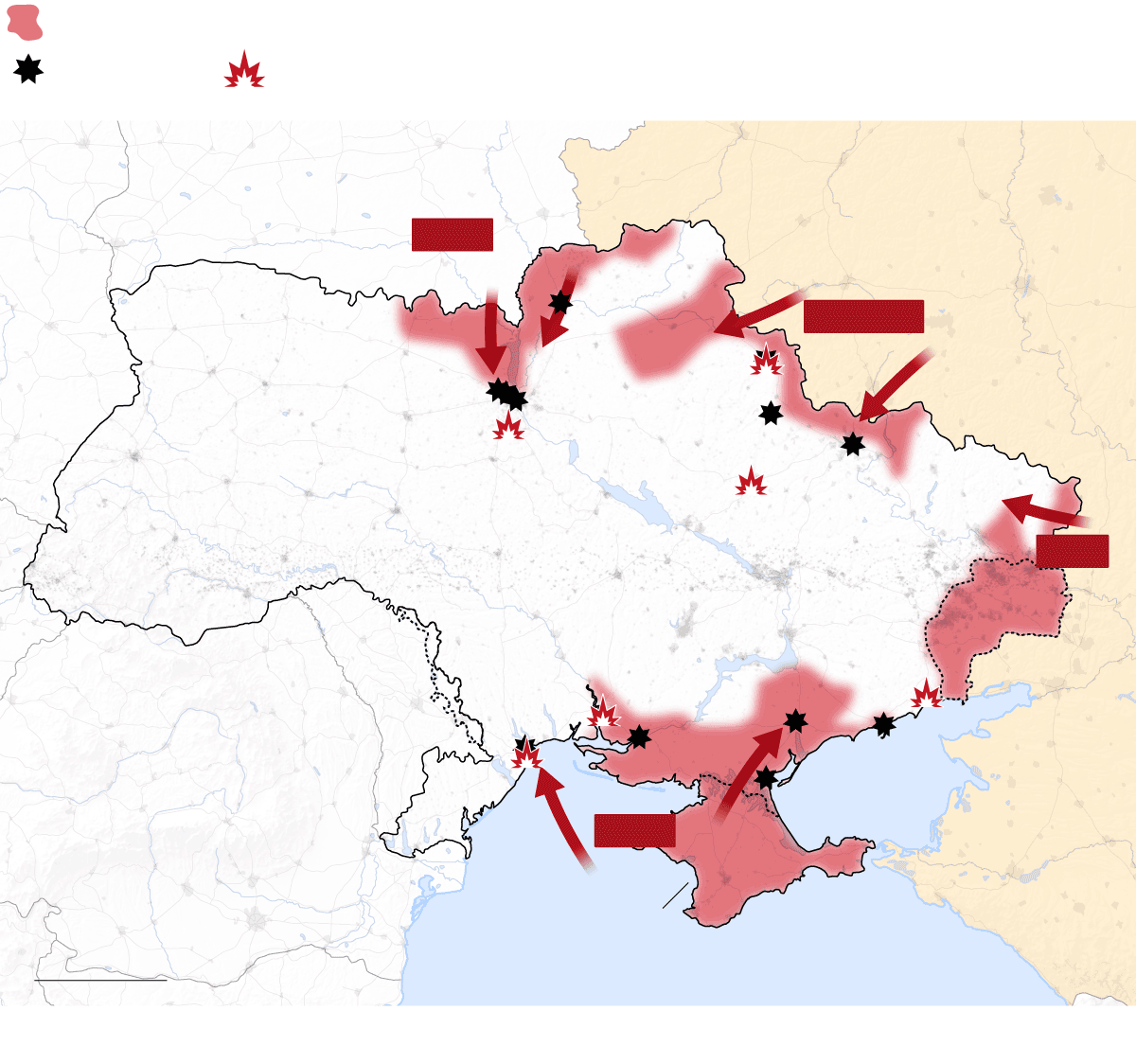 Las tropas rusas atacan Ucrania por tres frentes: al norte, por la frontera de Bielorrusia; al este, a través de la frontera con Rusia; y al sur, desde Crimea, la península que Rusia invadió y se anexionó ilegalmente en 2014. El Gobierno ucranio denuncia “un ataque a gran escala desde múltiples direcciones”. Las tropas rusas ocuparon terreno en todos los frentes, como mostraban los datos del Instituto para el Estudio de la Guerra (IWS).