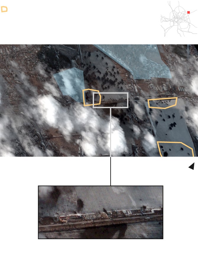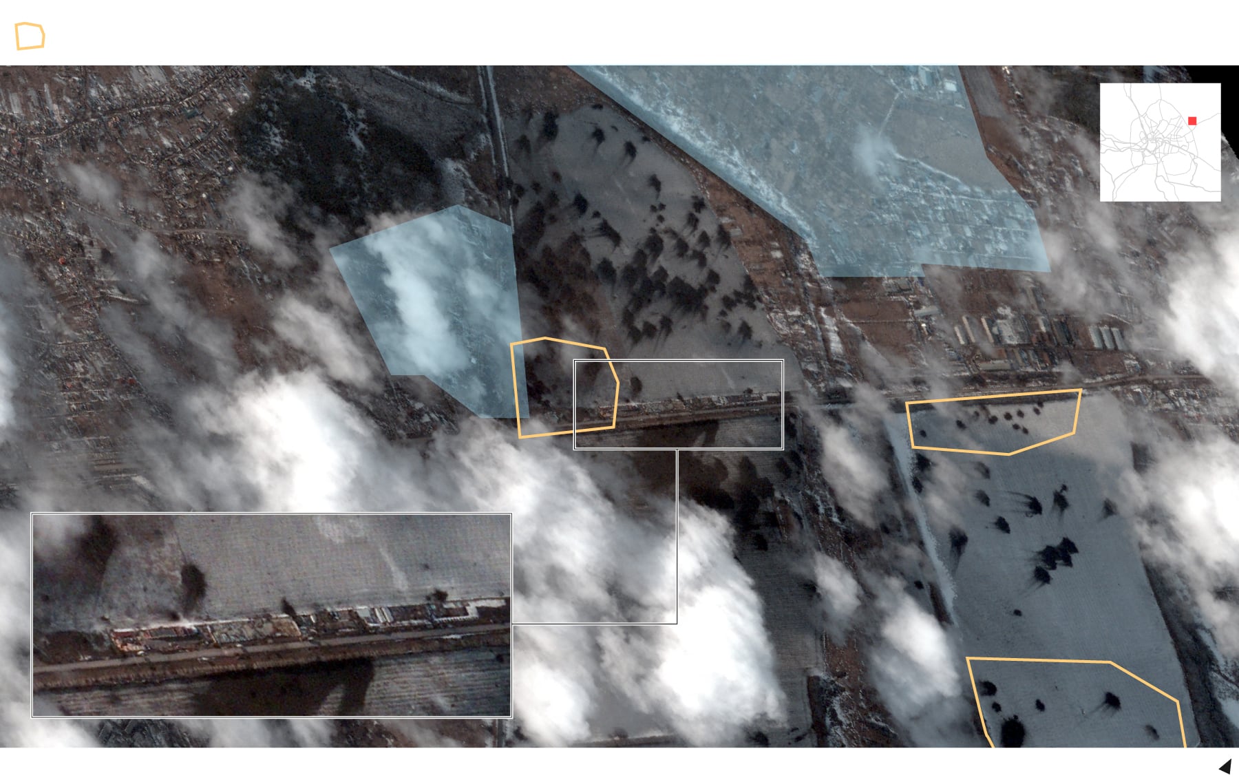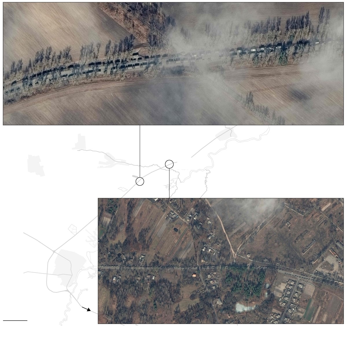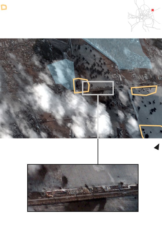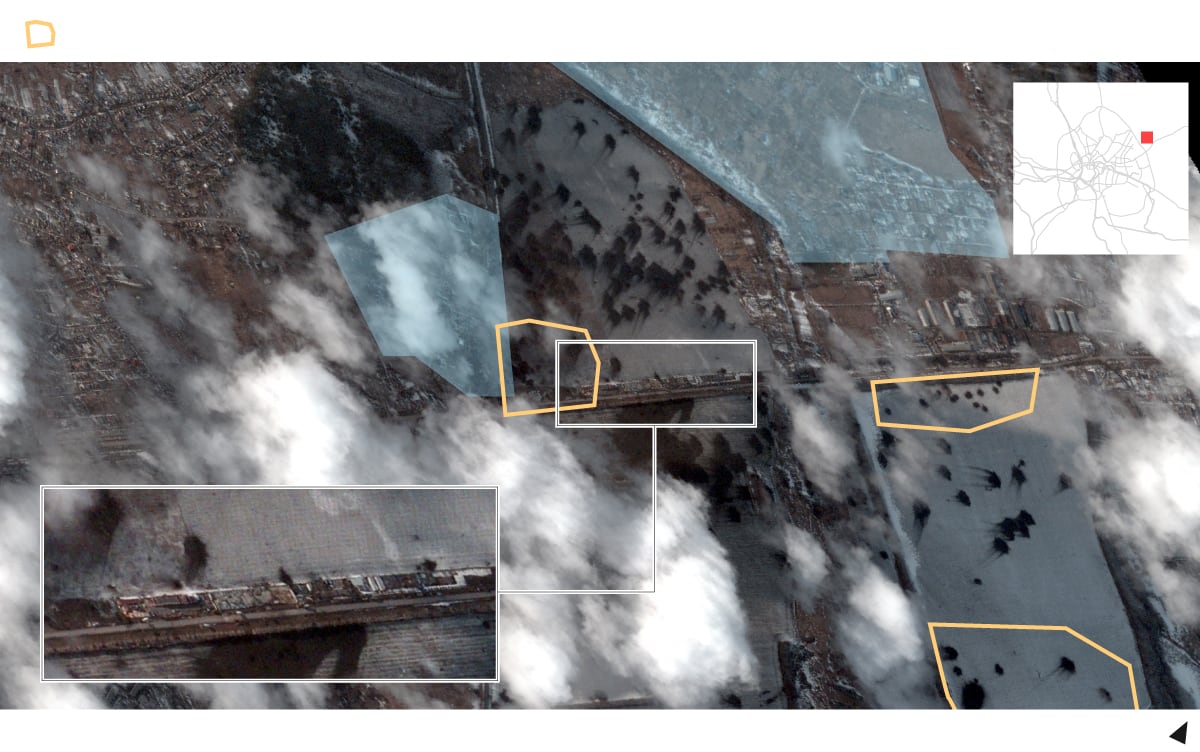 La imagen a continuación muestra el aeródromo Bolshoy Bokov, en Mazyr (Bielorrusia), en dos momentos —el 4 y el 22 de febrero—, y la llegada de 100 vehículos y docenas de acuartelamientos.
