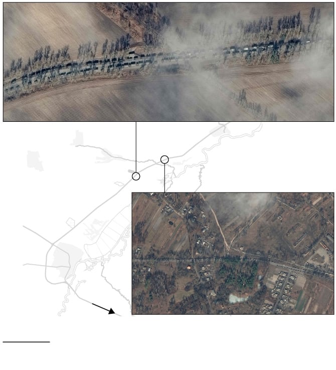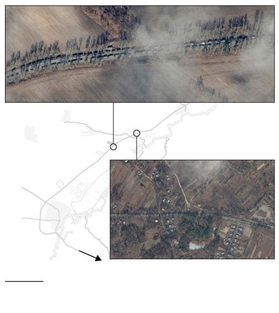 En el norte, los convoyes militares rusos están avanzando hacia el frente de Kiev desde la ciudad de Ivankiv, a unos 100 kilómetros por carretera de la capital.