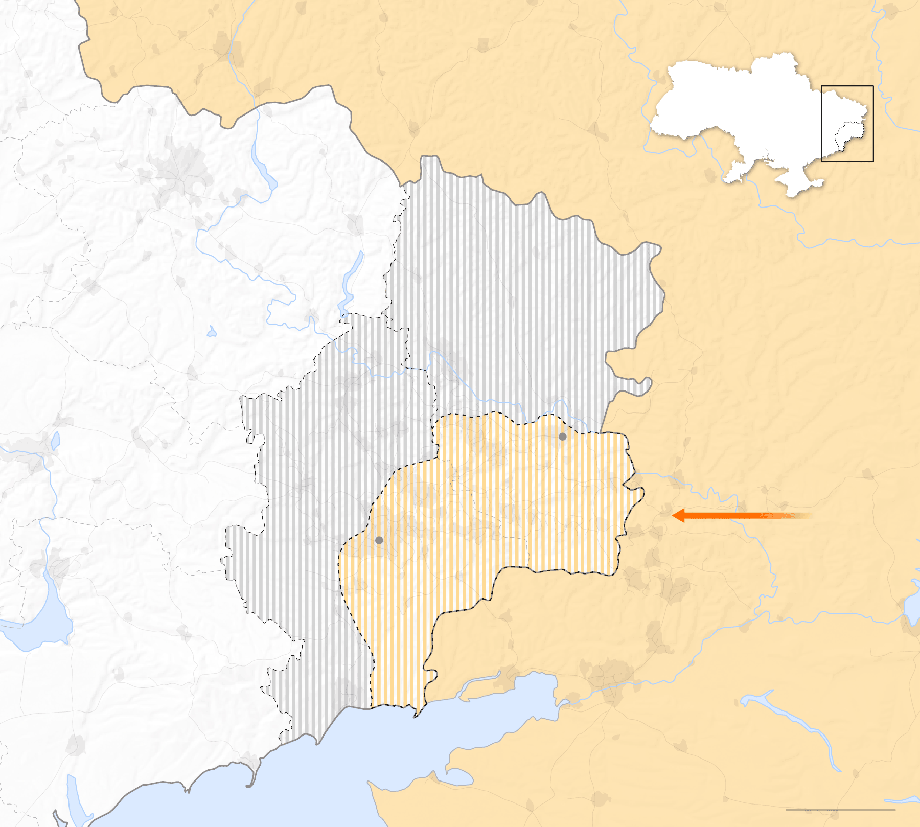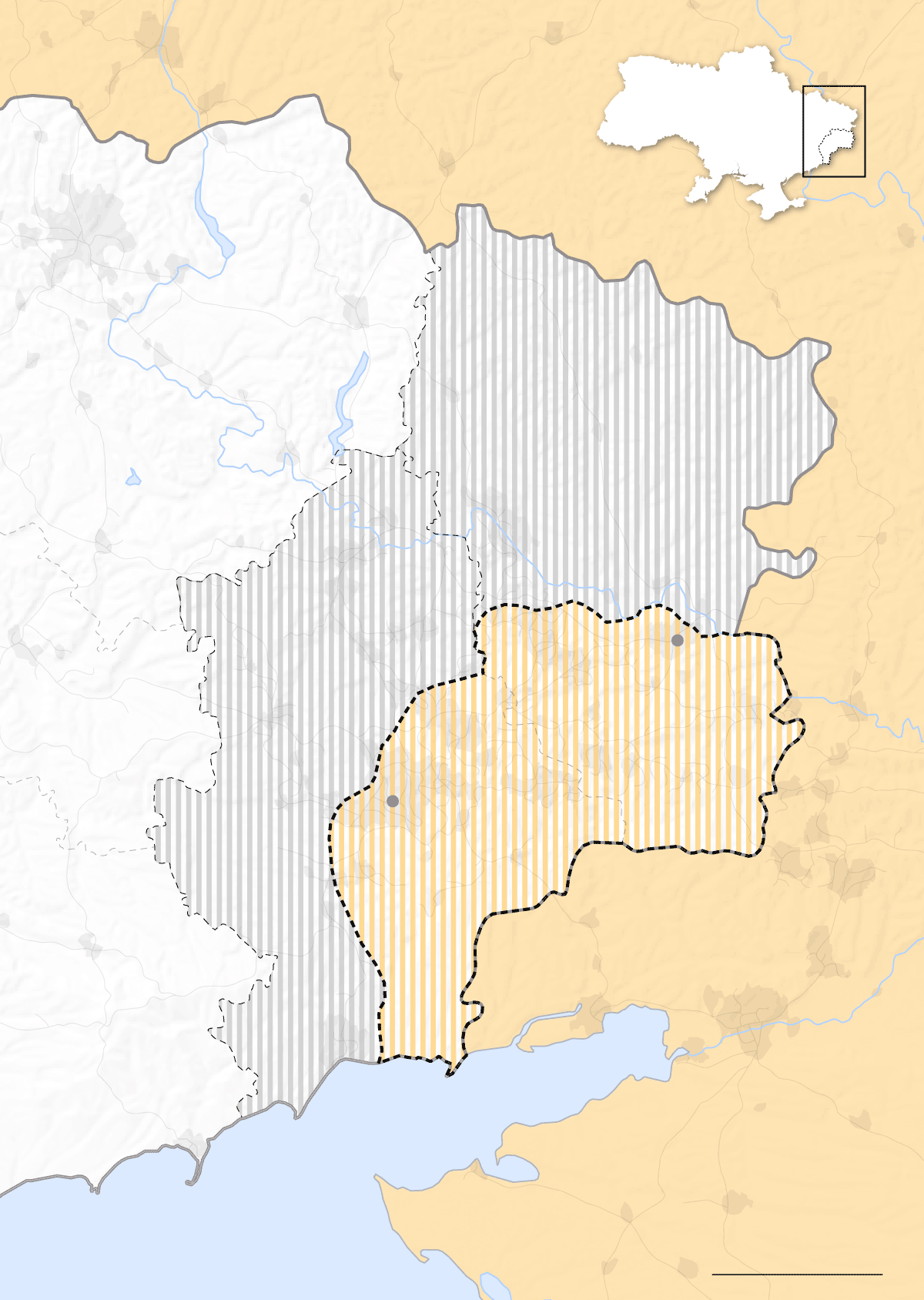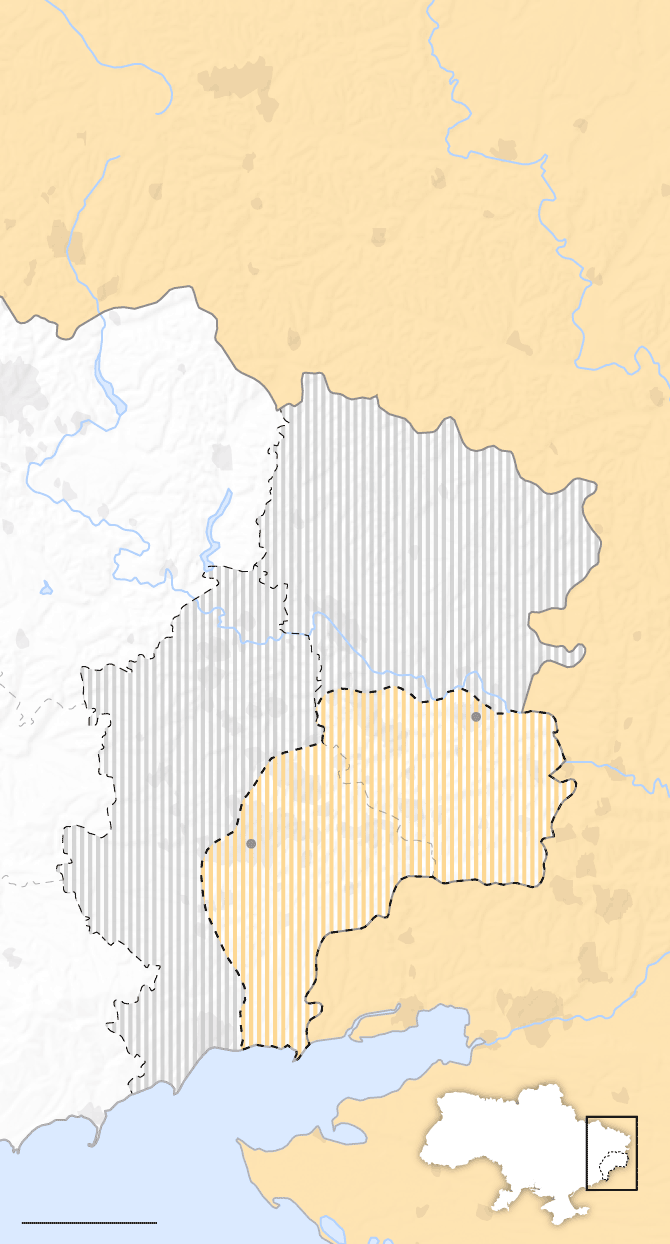 La contienda ha dividido el Donbás en dos áreas separadas por la línea del frente: la zona controlada por los separatistas respaldados por Rusia, en la frontera con ese país, y la que sigue bajo dominio de las Fuerzas Armadas de Ucrania, en el oeste. Los separatistas reclaman todo el territorio de Donetsk y Lugansk, pero solo controlan un tercio —unos 10.400 kilómetros cuadrados según la Organización de Seguridad y Cooperación en Europa (OSCE)—.