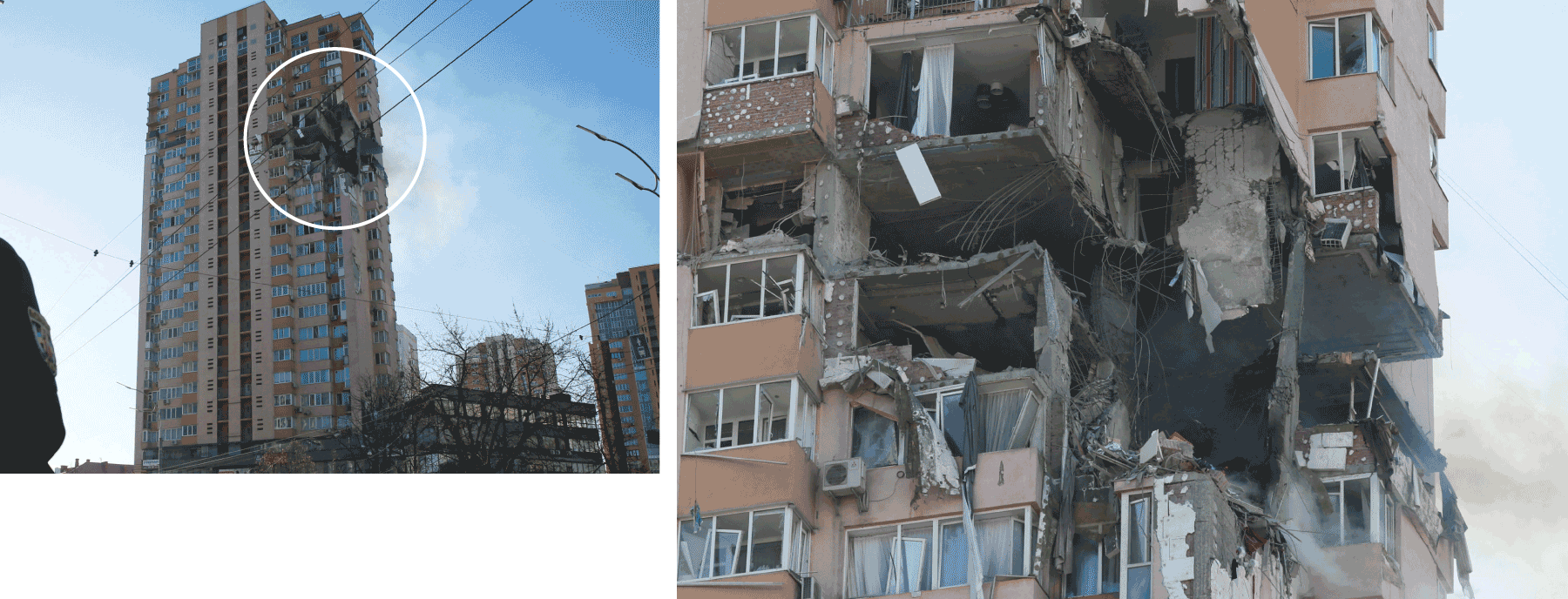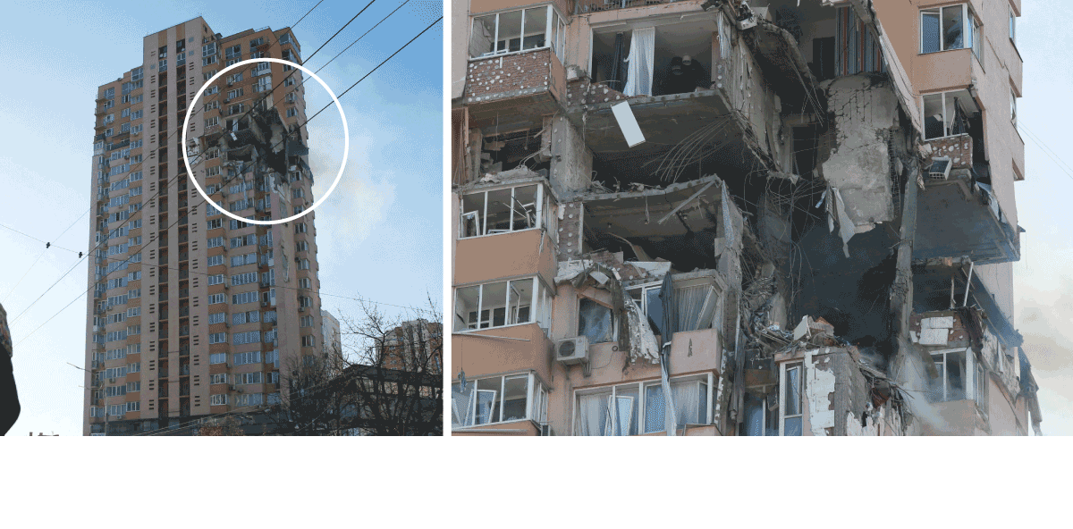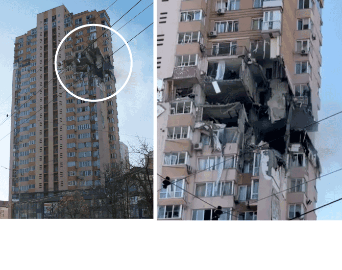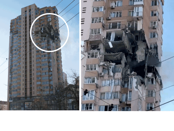Un edificio del centro de Kiev impactado por un misil