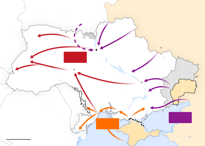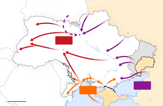 1. Opción Sur. Las tropas rusas tratarían de conquistar la franja de territorio ucranio ribereño del mar Negro. Esa franja iría desde la región del Donbás hasta llegar a Transnistria, en Moldavia, pasando por la península de Crimea, anexionada ilegalmente por Rusia en 2014. Esta posibilidad aseguraría el suministro de agua a Crimea, que Kiev cortó hace ocho años, y dejaría a Ucrania sin salida al mar.