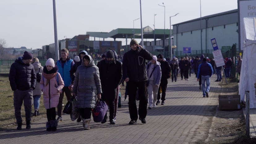 Centenares de personas huyen de Ucrania por la frontera polaca, mientras otros llegan desde países vecinos para apoyar la lucha contra el ejército ruso