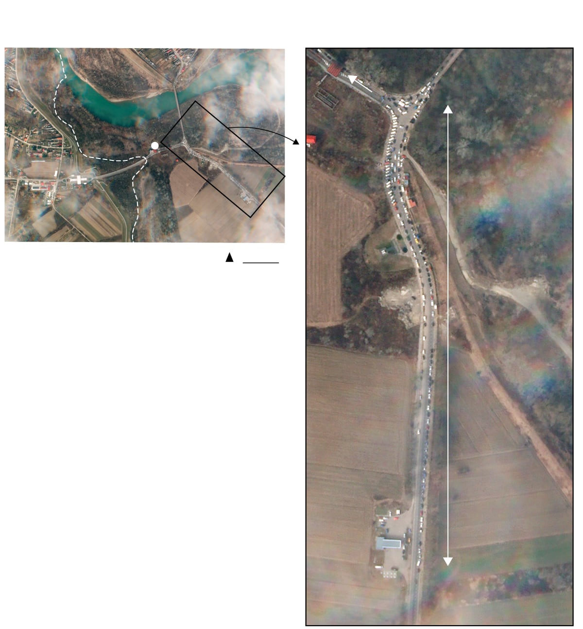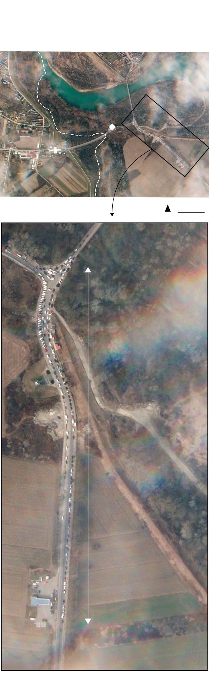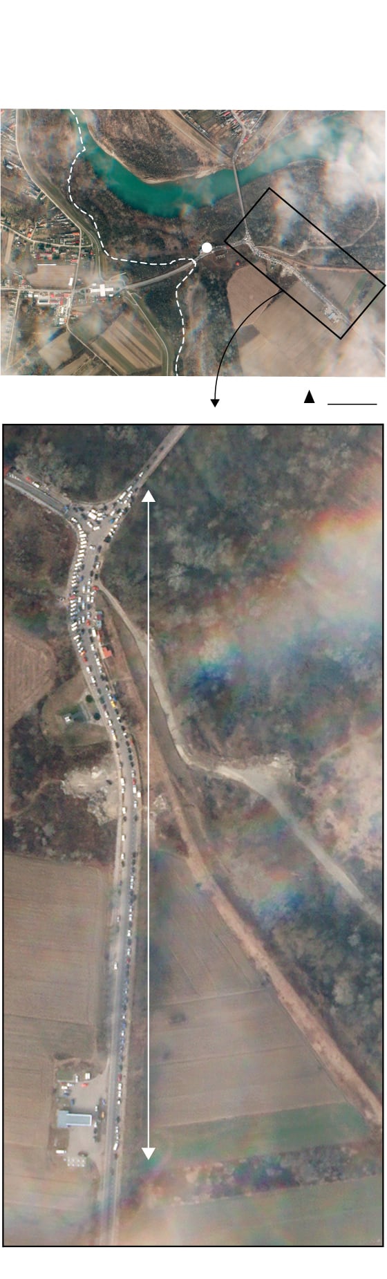 Una caravana de vehículos, de más de 700 metros de largo, espera para cruzar la frontera de Ucrania a Hungría.