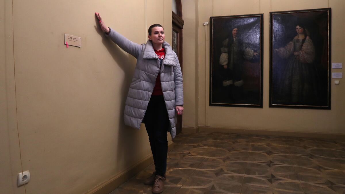 Voznyak es un hombre expeditivo que desde su despacho en el Palacio Potocki dirige a su plantilla como un pequeño ejército. Del cuello le cuelga un pequeño walkie-talkie que utiliza al mismo tiempo que sigue de reojo la actualidad en una pantalla. Sobre su cabeza cuelga un retrato familiar de la emperatriz María Teresa de Austria, soberana de Galitzia, la región de la que fue capital Lviv. El palacio en el que está su oficina es la sede de la Galería Nacional de Arte. Es una mansión de estilo francés que construyó en 1880 como residencia el conde Alfred Józef Potocki, noble polaco que llegó a ser primer ministro del imperio austrohúngaro. Las estancias del palacio albergan una nutrida colección de pintura europea, pero no en todas las paredes hay colgadas obras: muchas están vacías después de que las pinturas fueran trasladadas a un refugio a prueba de bombas. En cada cartela de los cuadros que faltan hay una etiqueta rosa que el equipo de Hanna Legeza, subdirectora del museo, colocó para marcar las que los técnicos debían cargar en los camiones.
