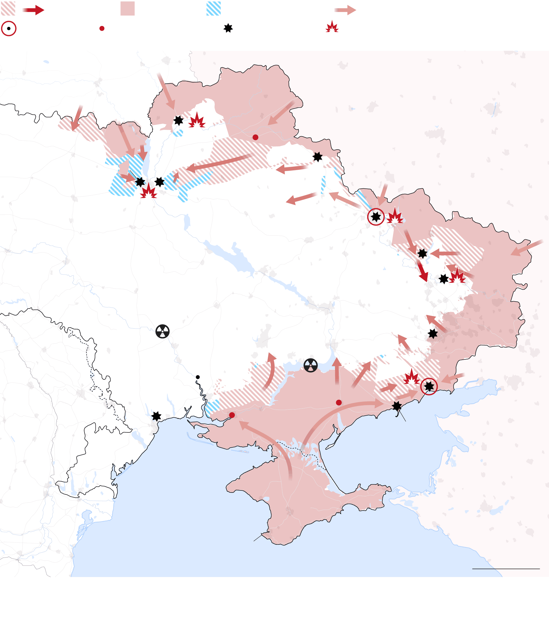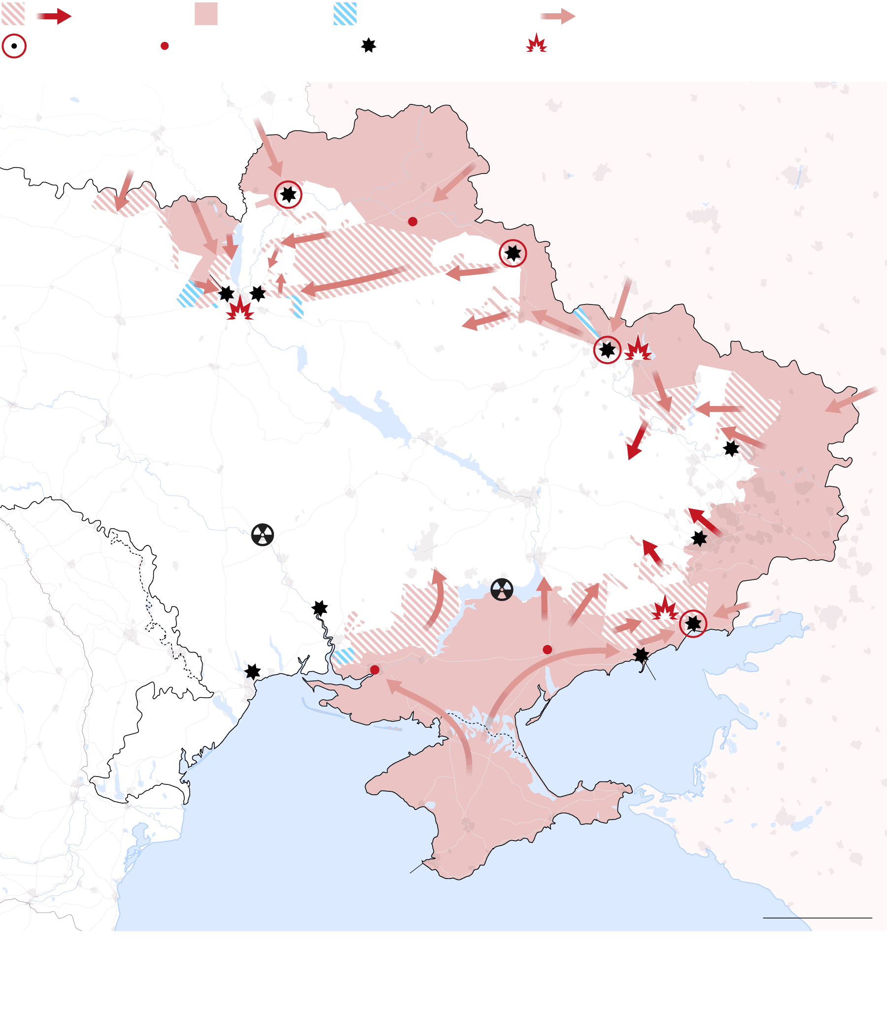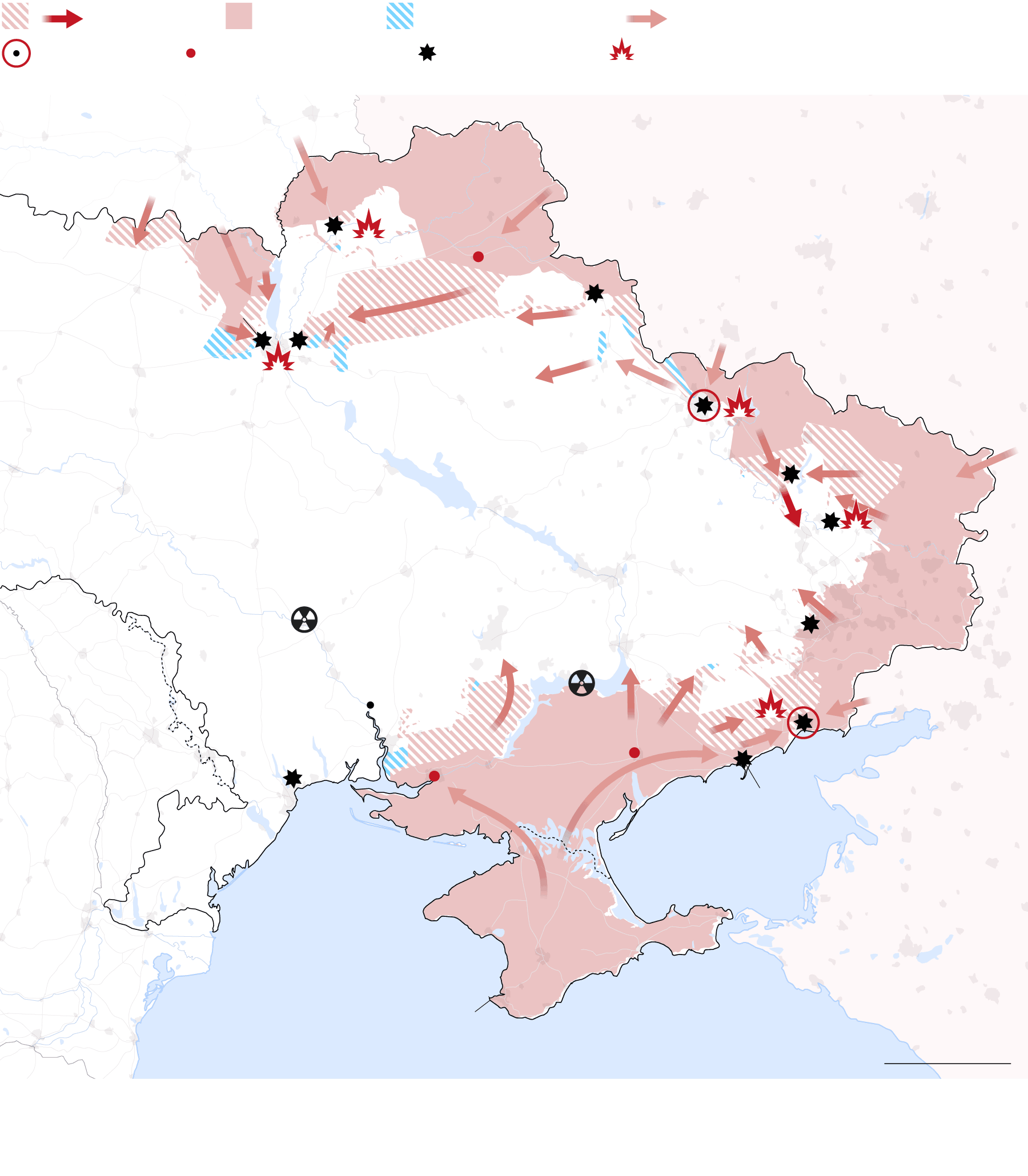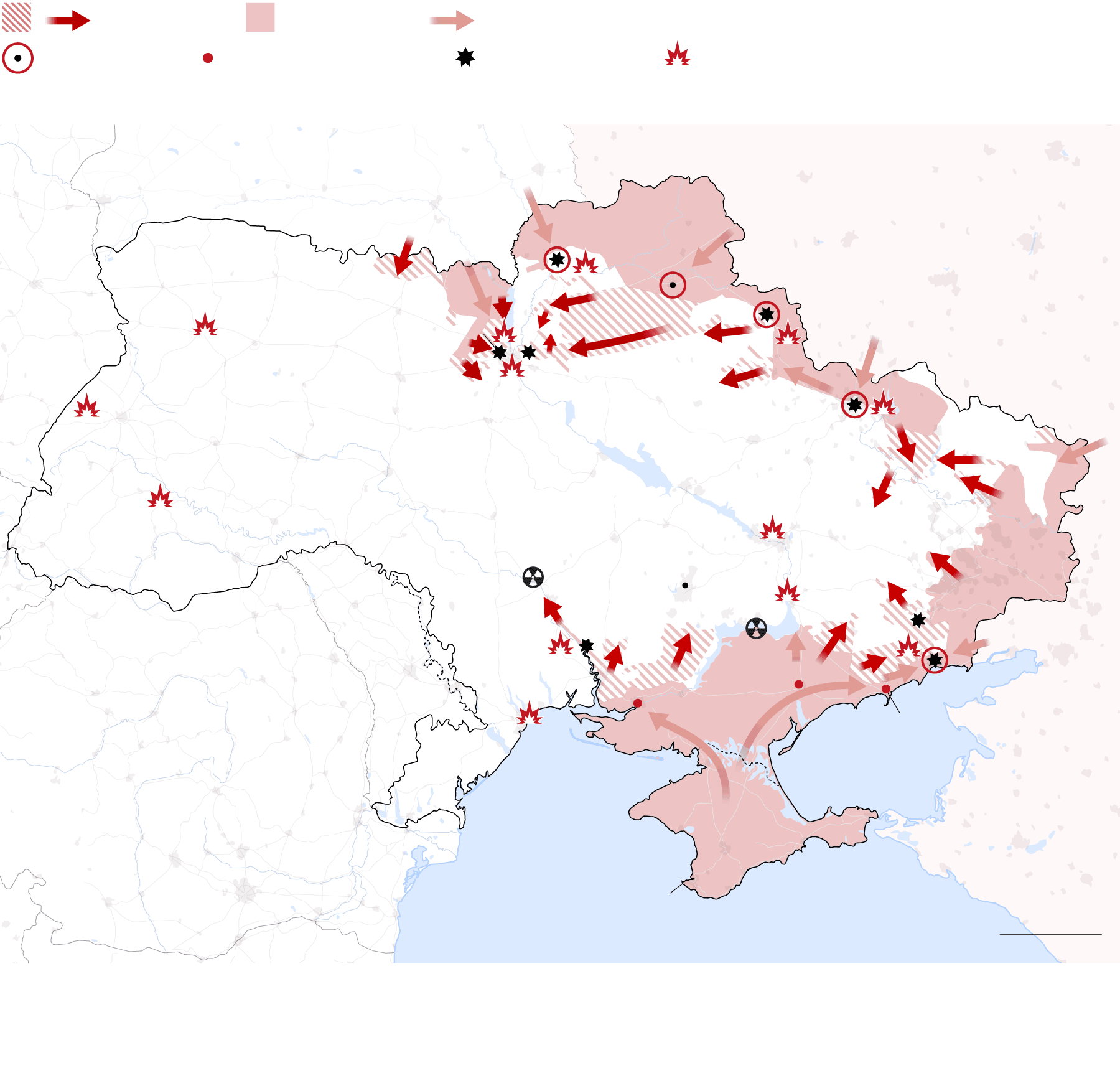 Nota: ¿Qué es control? Mantener influencia física sobre un área para evitar su uso por el enemigo. Puede lograrse ocupándola o dominándola con armas. No implica gobernanza ni legitimidad. Fuentes: Institute for the Study of War y American Enterprise Institute’s Critical Threats Project (para avances y zonas controladas); Inteligencia del Reino Unido (ciudades cercadas); EL PAÍS y otras fuentes (combates y bombardeos).
