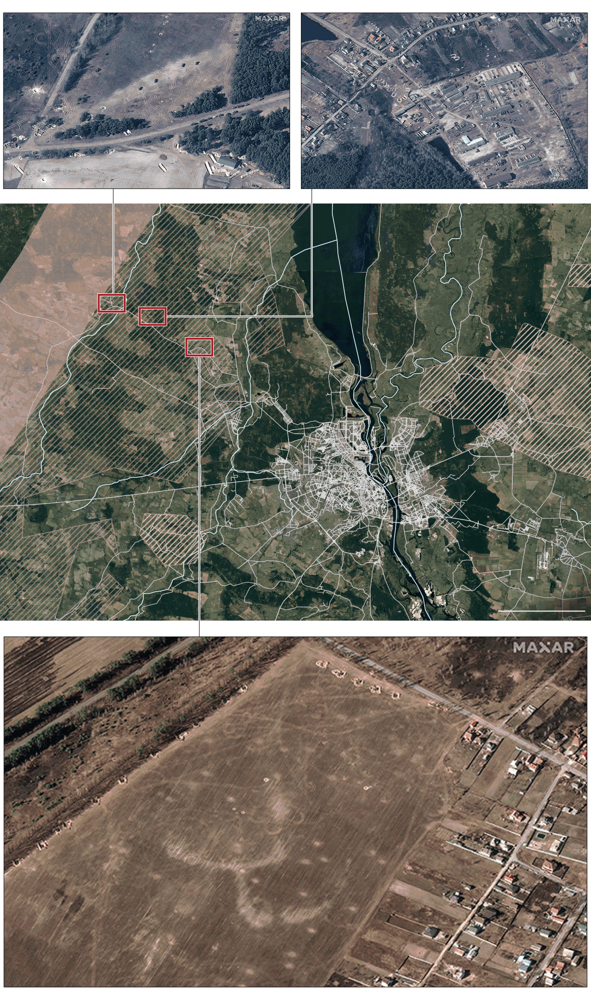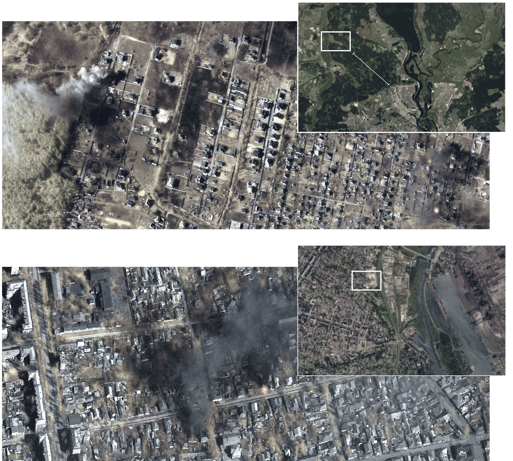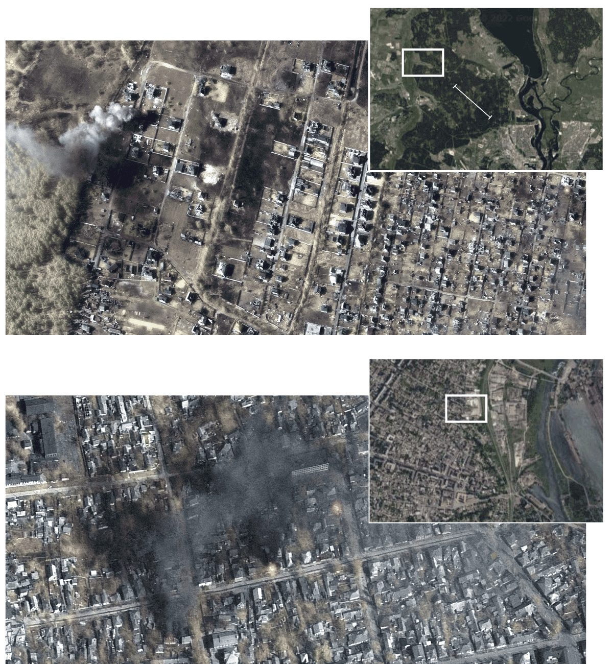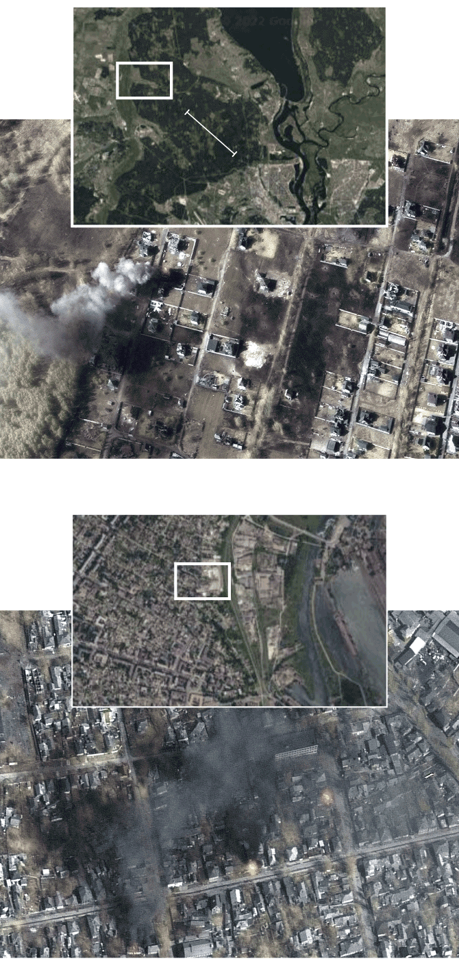 Nuevas imágenes satelitales publicadas este lunes por Maxar muestran el humo de los bombardeos sobre Mairupol. También en Moschun, una localidad 13 kilómetros al norte de Kiev, a su mismo lado del río Irpín. En la orilla opuesta es donde los rusos llevan días con el grueso de sus tropas desplegadas.