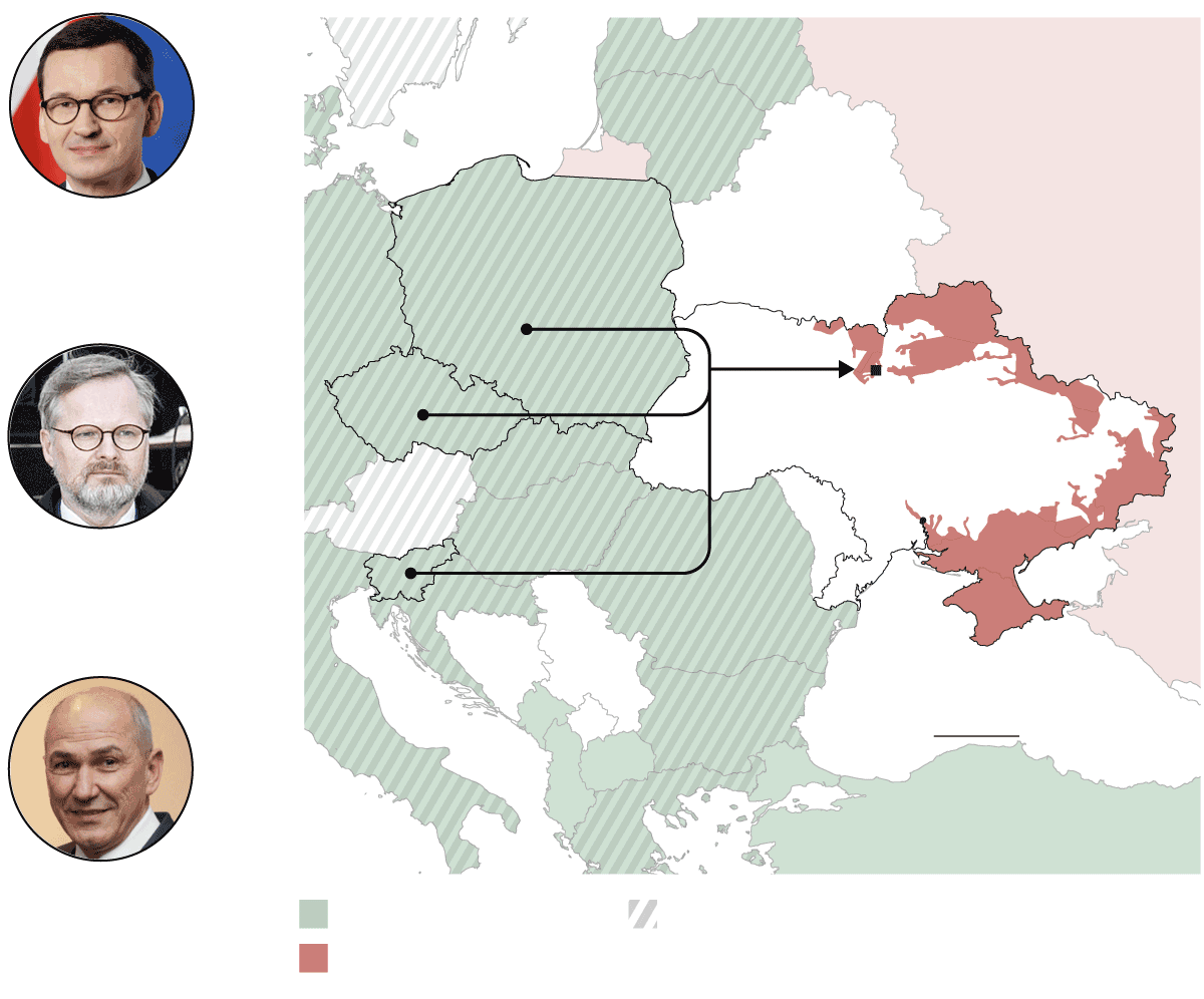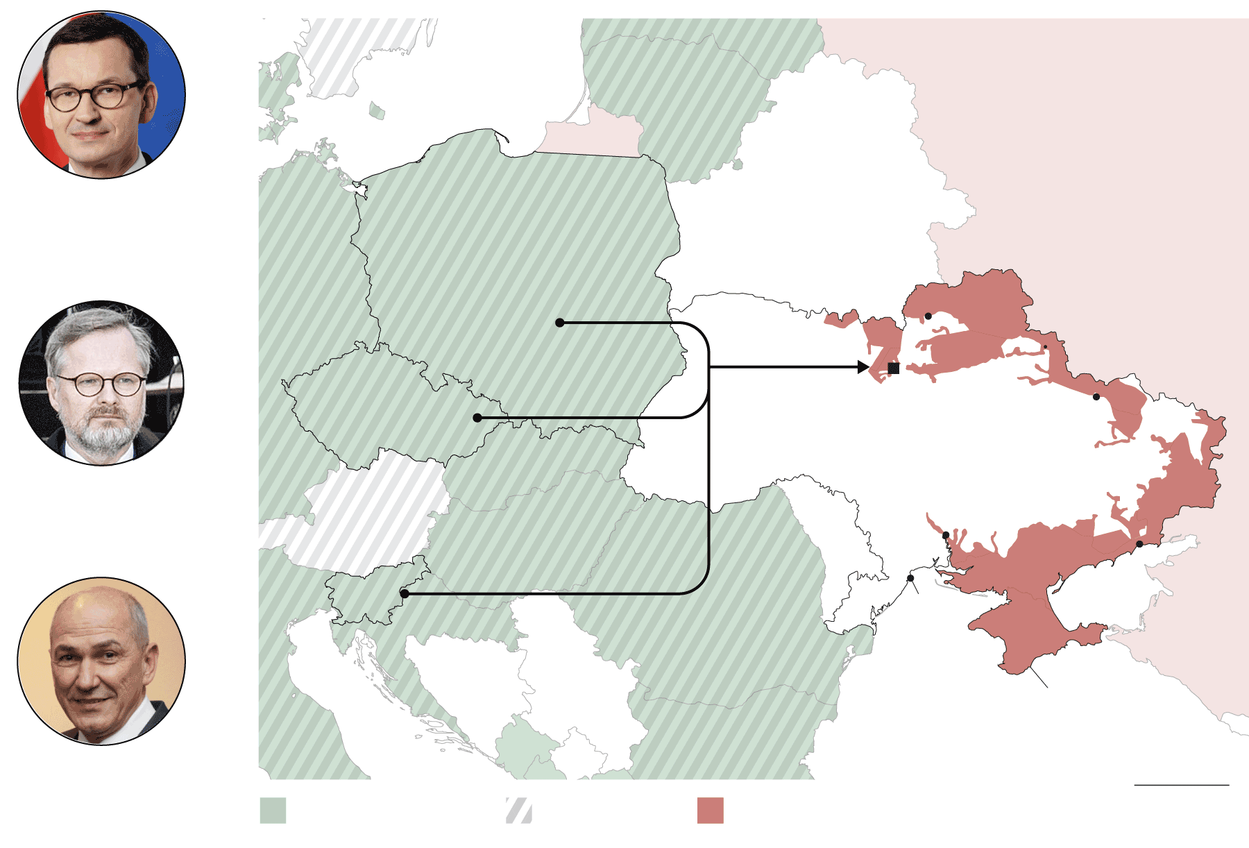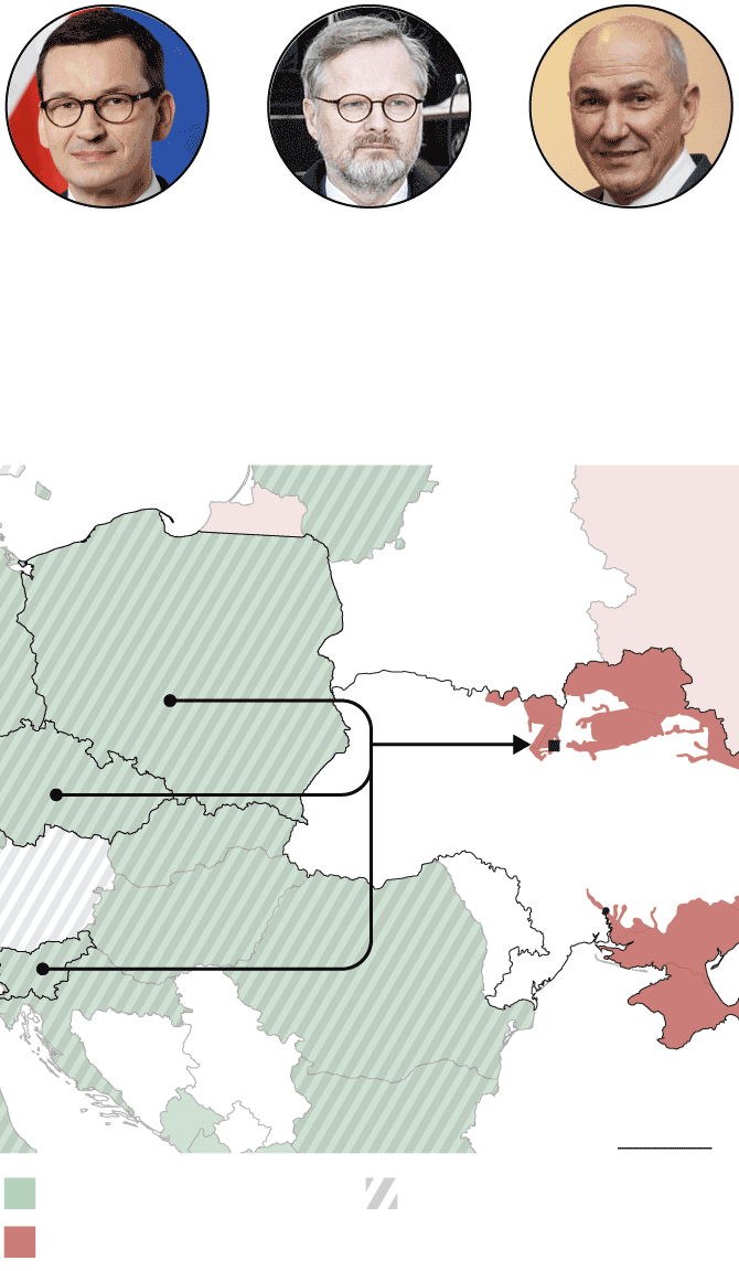 Los primeros ministros polaco, checo y esloveno viajan este martes camino de la capital ucrania. Prevén reunirse allí con el presidente Volodímir Zelenski, para transmitirle el “apoyo inequívoco” de los Veintisiete. Los tres líderes viajan en un tren que ya se encuentra en Ucrania, según ha informado la BBC.
