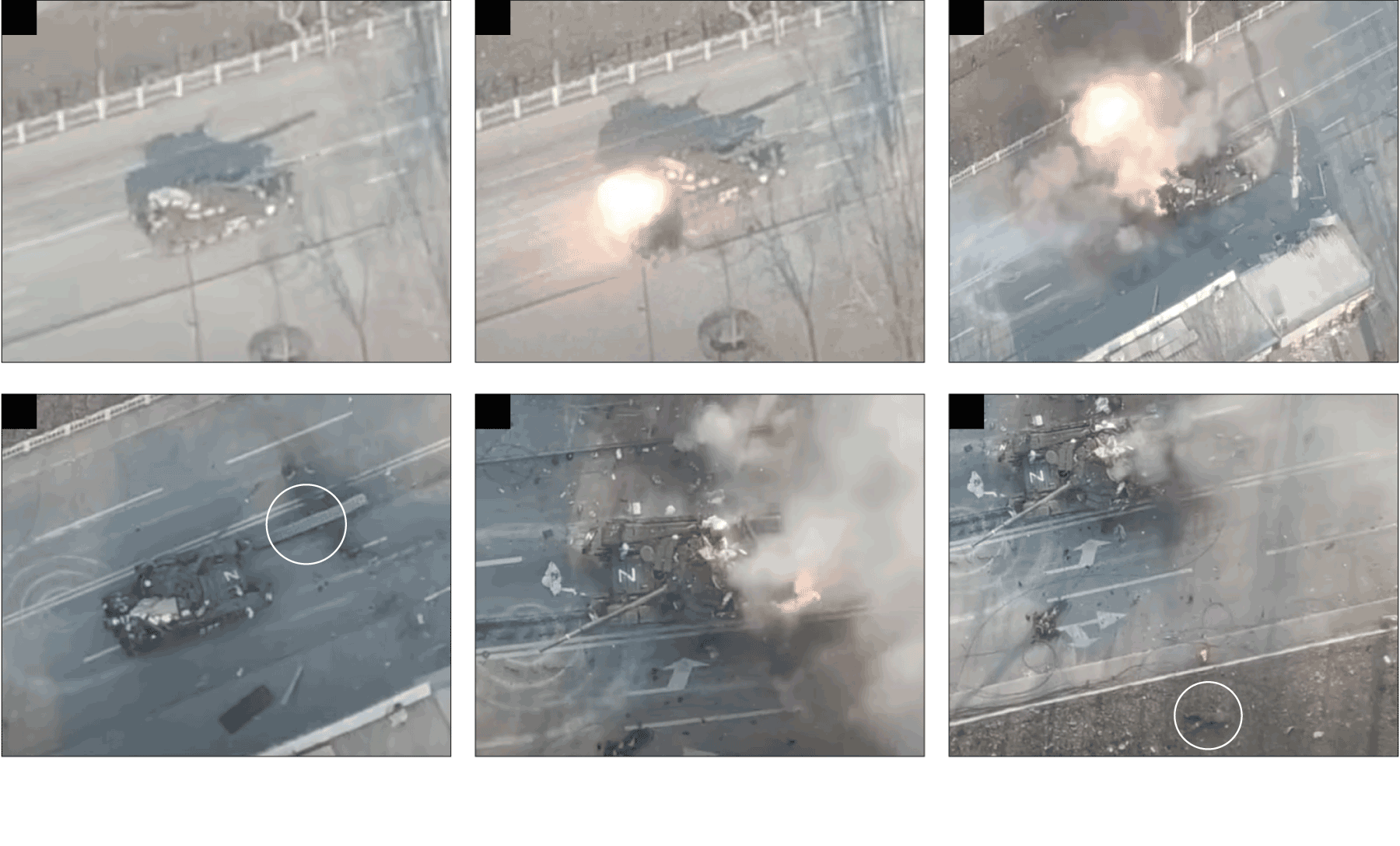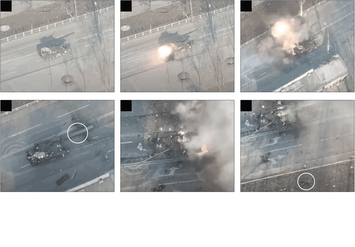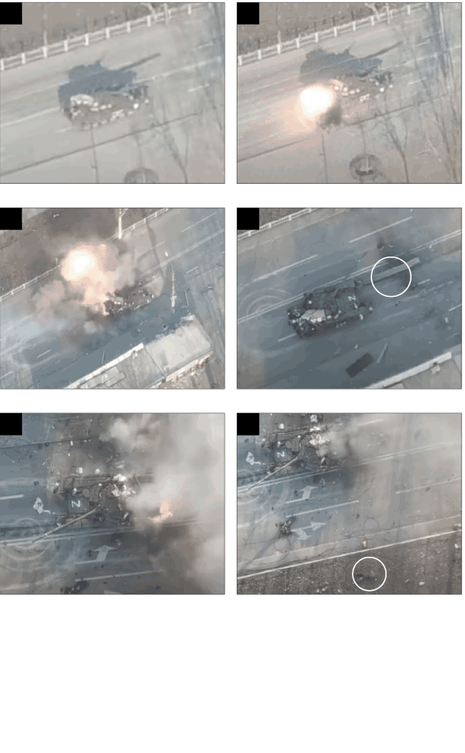 Tanque ruso atacado en las calles de Mariupol el día 16 de marzo. En la secuencia de vídeo, el vehículo recibe hasta cinco disparos de obus que le destrozan las cadenas. En la imagen 6 un soldado huye del tanque. Fuerzas Armadas de Ucrania.