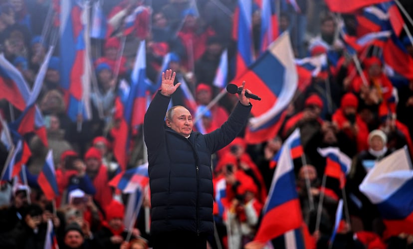 Vladímir Putin se ha dado un baño de masas en defensa de la guerra contra Ucrania. Con motivo del aniversario de la anexión de Crimea en 2014 tras un referéndum ilegal, y bajo el lema “Por Rusia, por un mundo/paz sin nazismo” (Mir significa ambas palabras), el Kremlin ha organizado un concierto en el estadio de la final del Mundial de 2018 donde se han podido ver las gradas repletas hasta la bandera. Allí, en un atrio alejado del resto de los participantes por varios metros de distancia y coreado por el público, el mandatario resaltó que su ofensiva es una misión “libertadora”.