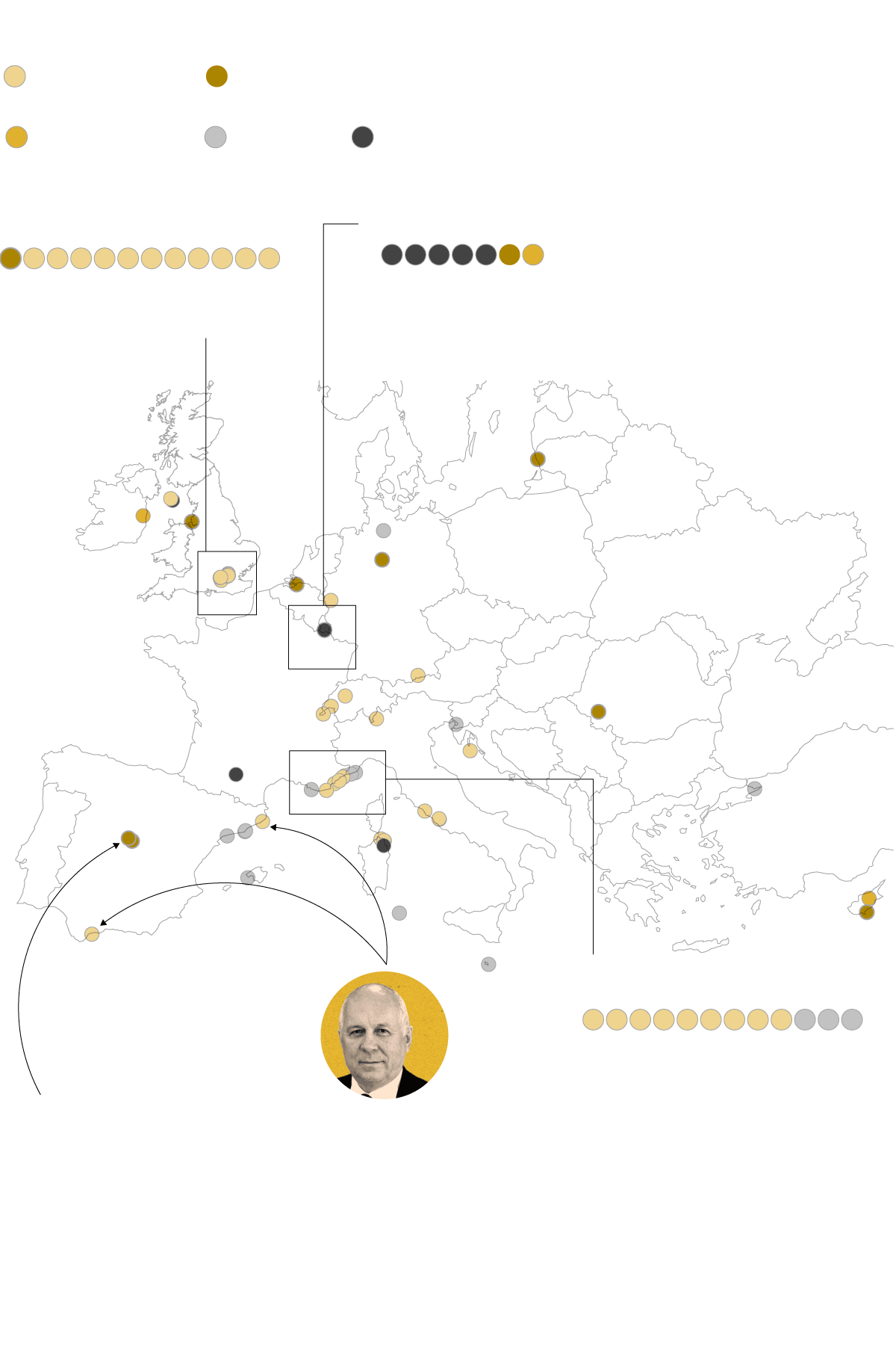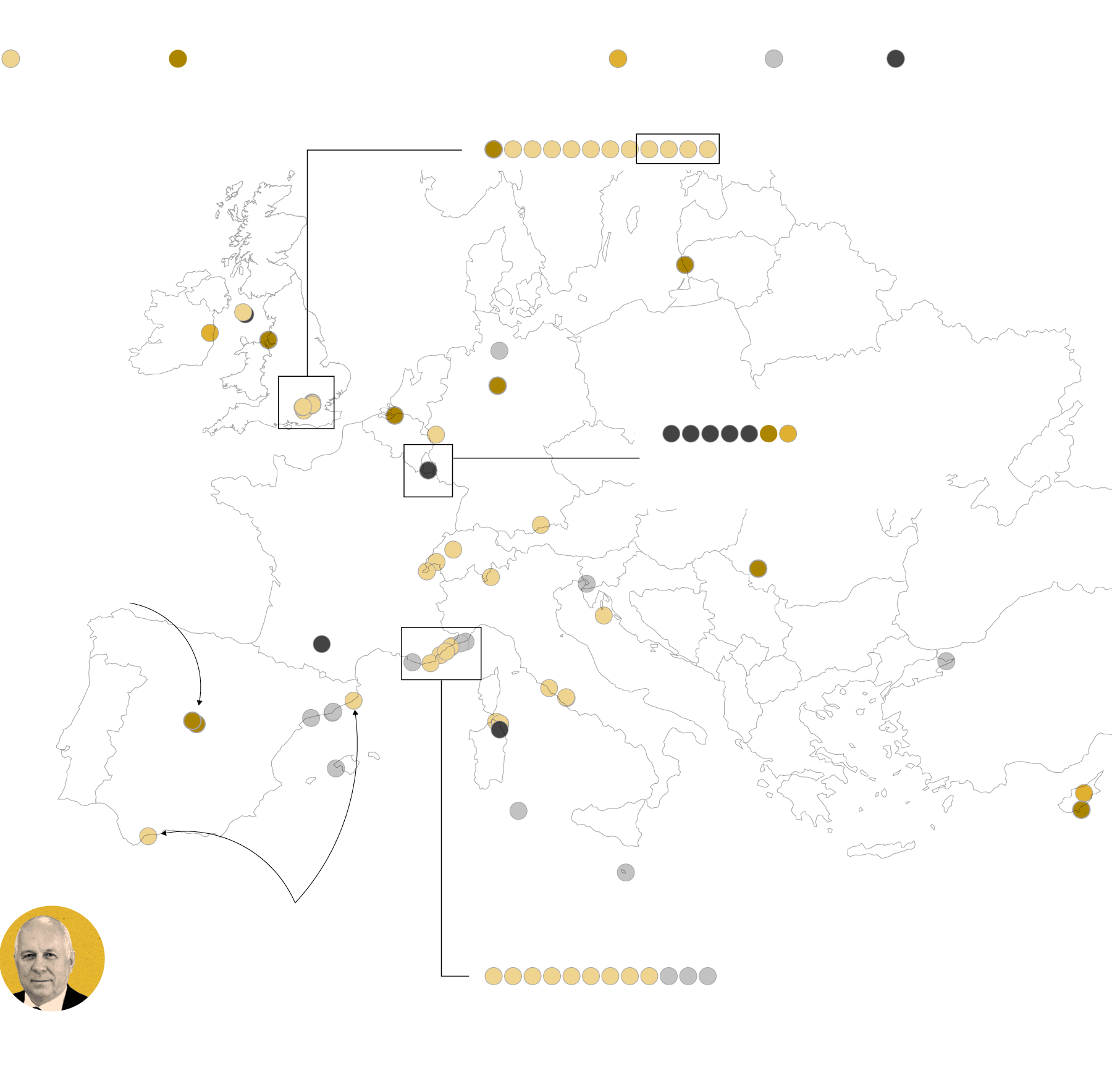 A continuación se muestran los más de 80 bienes que se pueden vincular a los 40 oligarcas a través de fuentes públicas hasta la entrada en vigor de las sanciones. Todo apunta a que es solo la punta del iceberg de sus intereses en el Viejo Continente.