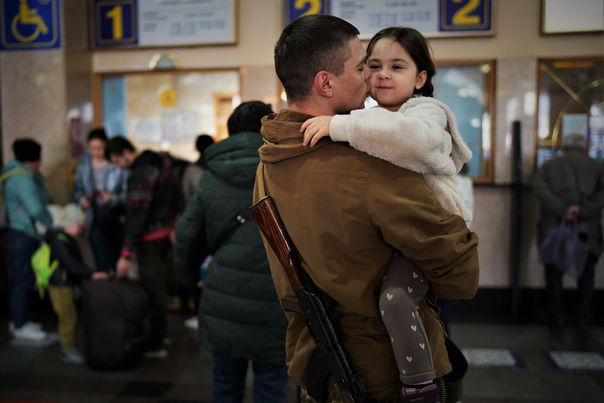 Camila se abraza a su padre. Le premia con besos, caricias, sonrisas… Anton se pasa a la niña de los hombros a los brazos. La levanta por los aires buscando entretenerla mientras le devuelve tanto cariño. Ambos juguetean mientras Elisabeth, la madre, hace cola ante la ventanilla número uno de venta de billetes de la estación de trenes de Kiev. Anton, de 30 años y con el rifle colgando de su espalda, está a punto de despedirse de su mujer y su hija. Ellas se van a Polonia. Él se queda en el frente de Irpin, una de las zonas clave desde donde se ha evitado la toma de Kiev.