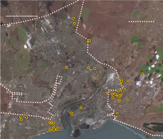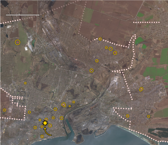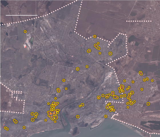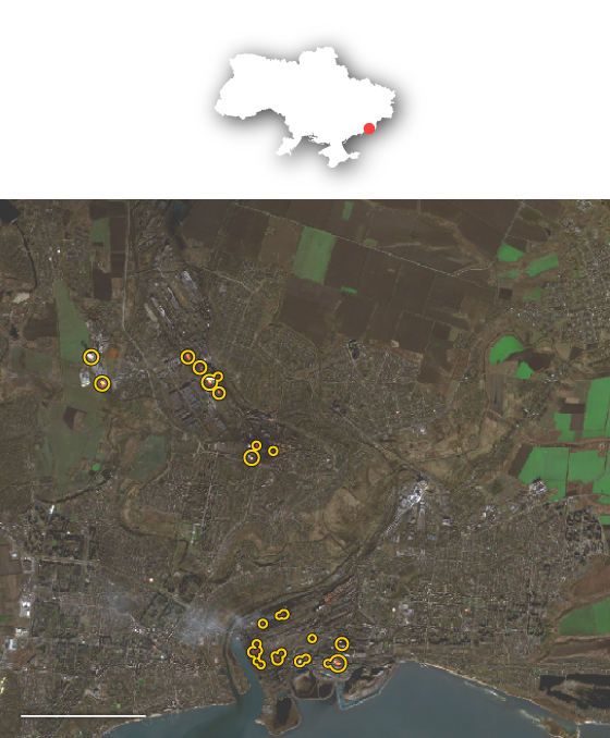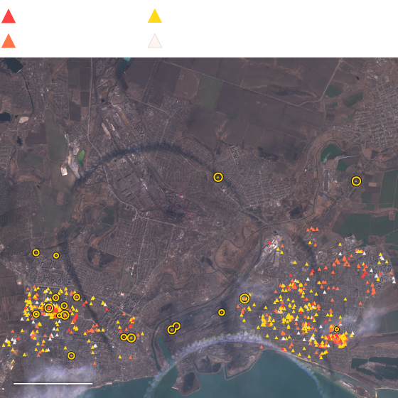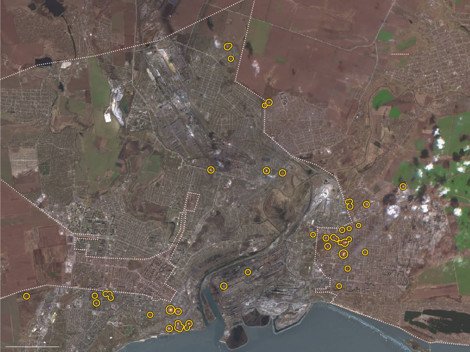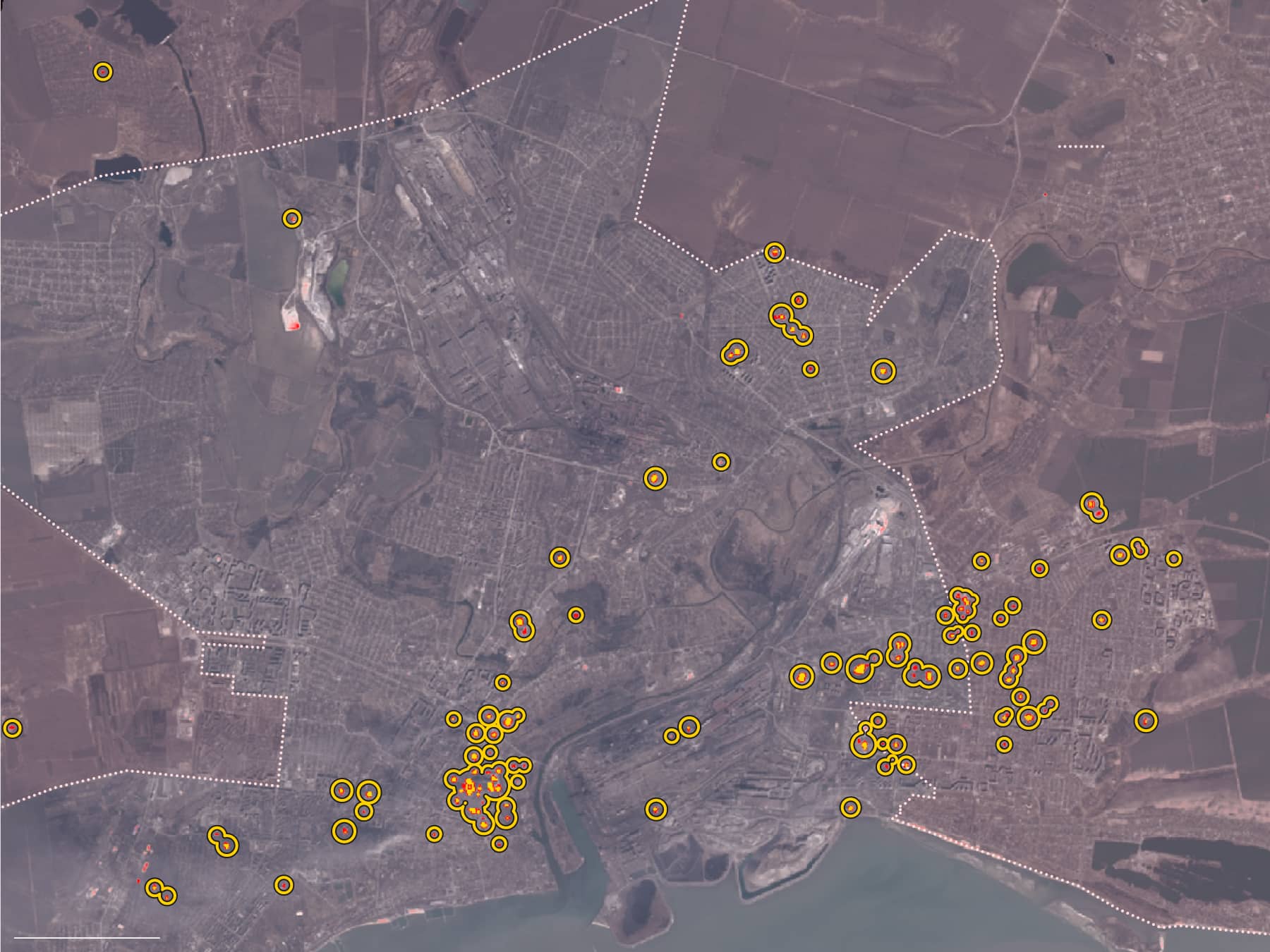 En la imagen se aprecian esos puntos en un día cotidiano en los altos hornos ubicados al norte y en la extensa fábrica de Azovstal, a orillas del mar de Azov, mientras en las zonas residenciales no se detecta nada. Tras el comienzo de la guerra, los focos de calor se han convertido en un diario de los bombardeos, explosiones y fuegos del conflicto.