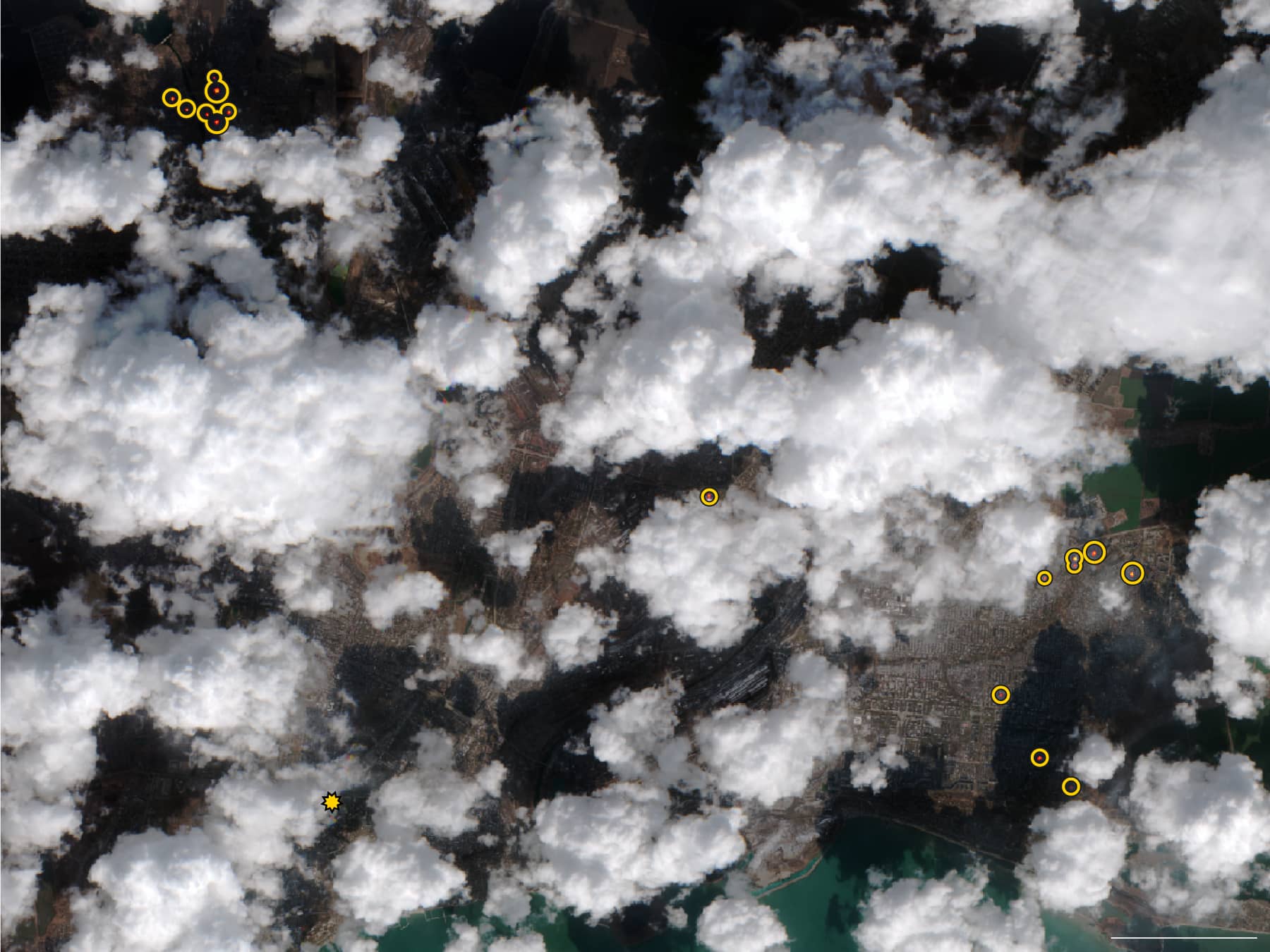 En este análisis se han combinado las imágenes que muestran el color verdadero del terreno con los puntos de calor que se detectan combinando rangos espectrales de infrarrojo cercano y de onda corta.
