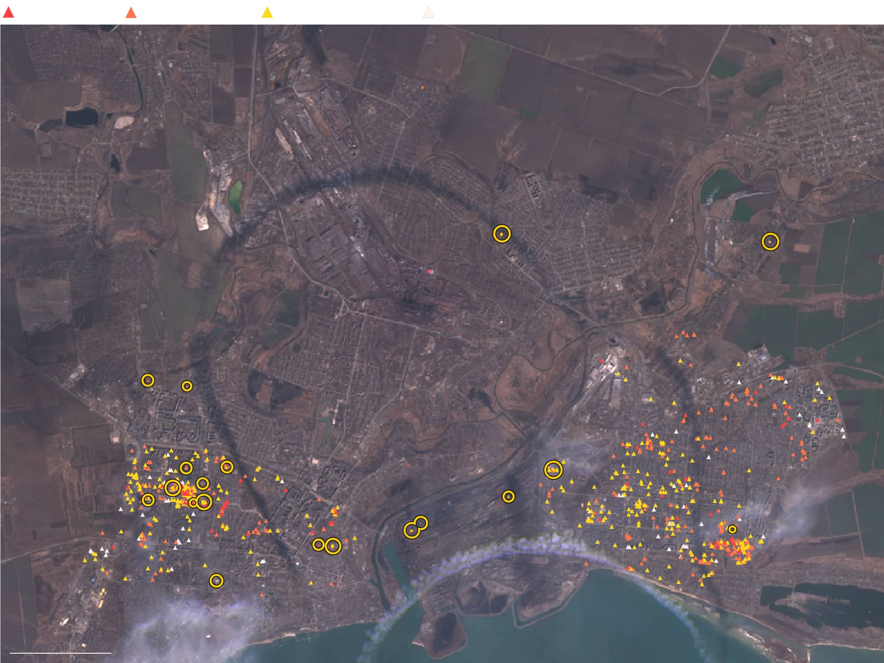 La completa desaparición de la actividad industrial en la ciudad se aprecia con claridad en la imagen del 19 de marzo. Las mayores concentraciones de focos de calor se ubicaban entonces en el centro, donde tres días antes se erguía el teatro de Mariupol. El bombardeo a este edificio se saldó con la muerte de unas 300 personas que se refugiaban en su interior, según las autoridades locales.
