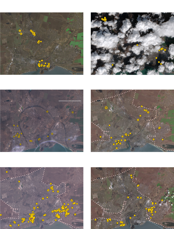 Los primeros pasos de las tropas rusas evidenciaron su avance hacia Mariupol desde diferentes direcciones. Según el Instituto para el Estudio de la Guerra (ISW), el 26 de febrero las fuerzas del Kremlin ya habían tomado la vecina ciudad de Berdiansk, al oeste, y las localidades de Pyschevik y Pavlopol, ubicadas al este, en el camino desde Donbás. A lo largo de este mes, la intensa nubosidad sobre la región impidió las mediciones del satélite.