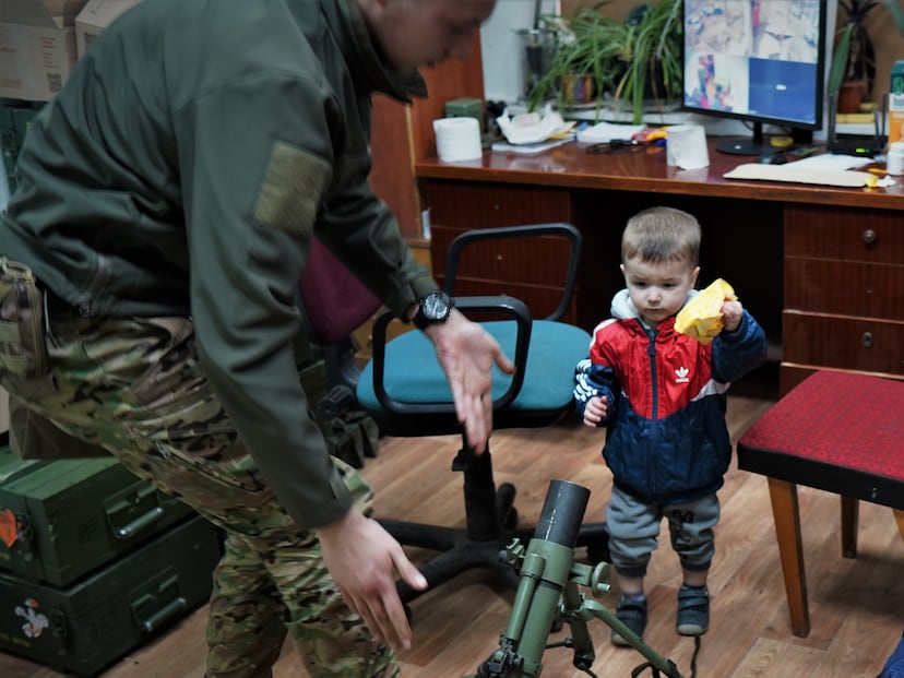 Un niño de algo más de un año da sus primeros pasos en una estancia repleta de armamento. Se mueve entre kaláshnikovs, proyectiles de mortero, pistolas y cajas de munición almacenadas en el cuartel de una de las unidades del Batallón Azov en Kiev. Es el hijo del responsable del grupo, Andréi, apodado El Filósofo. Con una mezcla de orgullo y preocupación, este médico reconvertido en militar recuerda el domingo 27 de febrero, el día que los rusos llegaron a Bucha, a las afueras de la capital. “Fue la primera vez que he tenido que enfrentarme al ataque de un helicóptero. Daba miedo. Estábamos trabajando con morteros, rodeados muy estrechamente”, cuenta en el despacho del edificio oficial que ocupan y que también hace las veces de dormitorio.