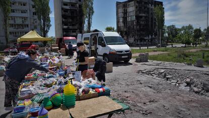 En el puesto de Serguéi, de 32 años, protegido del sol con una tela con los colores azul y amarillo de la bandera ucrania, se puede comprar casi de todo. Desde conservas a productos de higiene. “Tenemos más clientes que antes de la guerra porque los comercios están cerrados, pero los que vienen a comprar se llevan menos cosas”, explica.