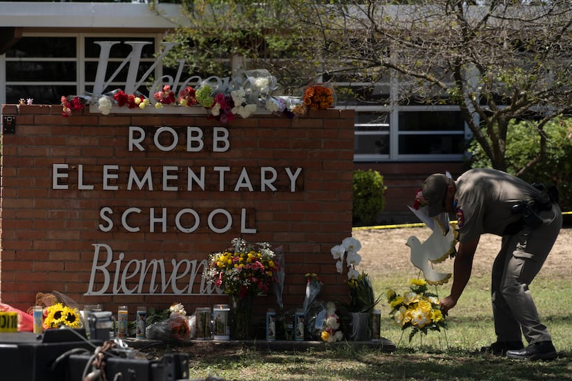 Un oficial coloca flores a las afueras de la Escuela Primaria Robb en Uvalde, Texas después del tiroteo.