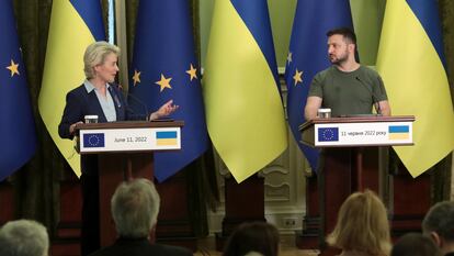 “Ucrania ya iba por buen camino antes de la horrible y atroz invasión de Rusia”, subrayó el sábado Von der Leyen en su intervención, junto a Zelenski, en el complejo presidencial de Kiev. “Ucrania es una democracia presidencialista, parlamentaria, sólida y bien cimentada”, añadió, “tiene instituciones bien ancladas, una Administración que funciona a todos los niveles”. En cualquier caso, para Von der Leyen, Ucrania aún necesita avances. “Hay que hacer más”, indicó el sábado, apuntando especialmente hacia el Estado de derecho y la corrupción.