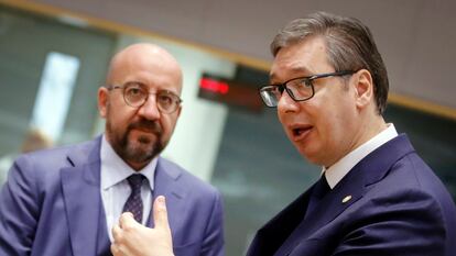 Buena parte de los Veintisiete pretenden dejarle claro al líder serbio, Aleksandar Vucic, que en estos momentos no hay gamas de grises. Los tiempos bélicos exigen tomar partido. “Antes de dar futuros beneficios a Serbia, tenemos que tener claro su compromiso de alineamiento con los valores europeos”, asegura una alta fuente diplomática. “Este es el momento de la definición. Y los actos son lo que te definen. Esperamos de Serbia mucho más”, apunta. “Seremos francos con ellos”, añade otro diplomático de primer rango. “Pediremos de forma clara un alineamiento con las sanciones de la UE contra Rusia”. Esta misma exigencia aparece también escrita de modo contundente como aviso a todos los candidatos en el borrador de conclusiones de la cumbre, al que ha tenido acceso EL PAÍS. Pero el aviso apunta de manera velada a Serbia.