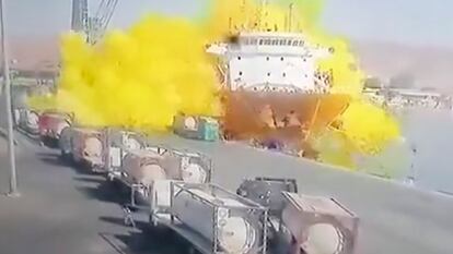 Imágenes del siniestro, emitidas por la televisión estatal jordana y difundidas a través de las redes sociales, mostraron el momento del impacto del contenedor sobre el casco del buque y la inmediata expansión de una nube amarilla, mientras grupos de operarios corrían por los muelles para intentar ponerse a salvo. El barco tenía como destino el país africano de Yibuti.