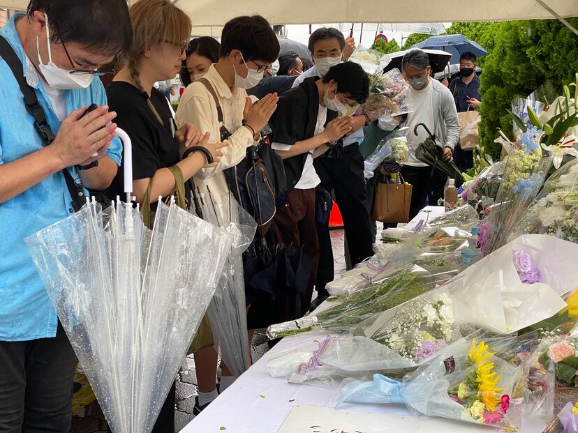 Una pareja de unos cincuenta años que acababa de ofrecer rosas blancas ante el altar, juntando las manos e inclinando la cabeza, considera que el magnicidio podría afectar la imagen del país, que no obstante, en su opinión, sigue siendo seguro. La esposa, que recuerda que el uso de armas de fuego está muy controlado en Japón, critica a los servicios secretos que protegían a Abe por permitir que un hombre sospechoso “se acercara a tres metros”, aunque reconoce que era difícil detectar un artefacto casero que no tenía la apariencia de un arma de fuego. Su marido apostilla que lo único que va a cambiar es la forma de hacer campaña. “Pero espero que la gente salga el domingo a votar, pues Abe-san [el señor Abe], trabajó por eso”, afirma.