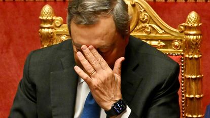 La mañana había empezado mejor para Draghi. El clima era de optimismo antes de la comparecencia de Draghi a las 9.30. La prima de riesgo de Italia caía a primera hora de la mañana y la Bolsa no daba síntomas de preocupación. Draghi no podía ignorar la descomunal presión que ha recibido para no dimitir. Desde Bruselas a Washington, pasando por el presidente de Ucrania, Volodímir Zelenski, le solicitaron estos días que diera marcha atrás a la decisión de renunciar tomada el jueves de la semana pasada. Y así fue. El expresidente del BCE, en un largo y denso discurso en el Senado, reseñó las grandes obras de su Ejecutivo en los últimos 17 meses, señaló los motivos de la ruptura y la necesidad de reconstruir la unidad nacional para seguir adelante. Atribuyó su cambio de postura al enorme apoyo popular recibido en las últimas horas, pero lo condicionó también al de los partidos.